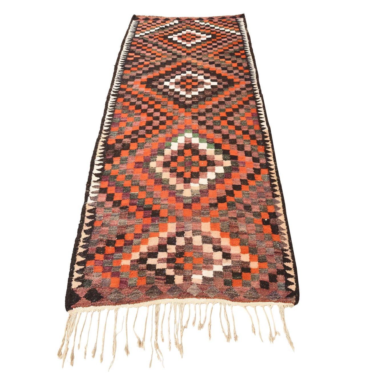 A 5x8 rectangular Kilim Fars rug with a vibrant red, black, and multi-color checkered pattern, featuring tribal motifs and fringe.
