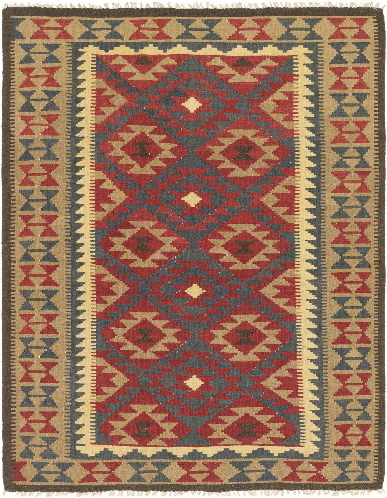 Primary color is Burgundy. Colors in this rug include: Burgundy, Brown, Cream, Light Brown, Navy Blue.
