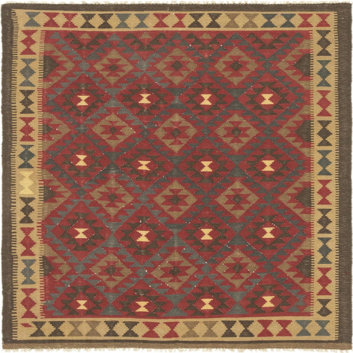 The Kilim Maymana collection presents a hand-woven 5x8 rug crafted from 100% wool, showcasing a traditional design with a contemporary edge. This rug features a rich burgundy background, accentuated with beige, brown, cream, and navy blue patterns. The design incorporates a series of geometric motifs, arranged in a diamond lattice that offers both symmetry and visual intrigue. The texture is pleasantly tactile, a testimony to its hand-woven construction, which can add depth and character to any room.