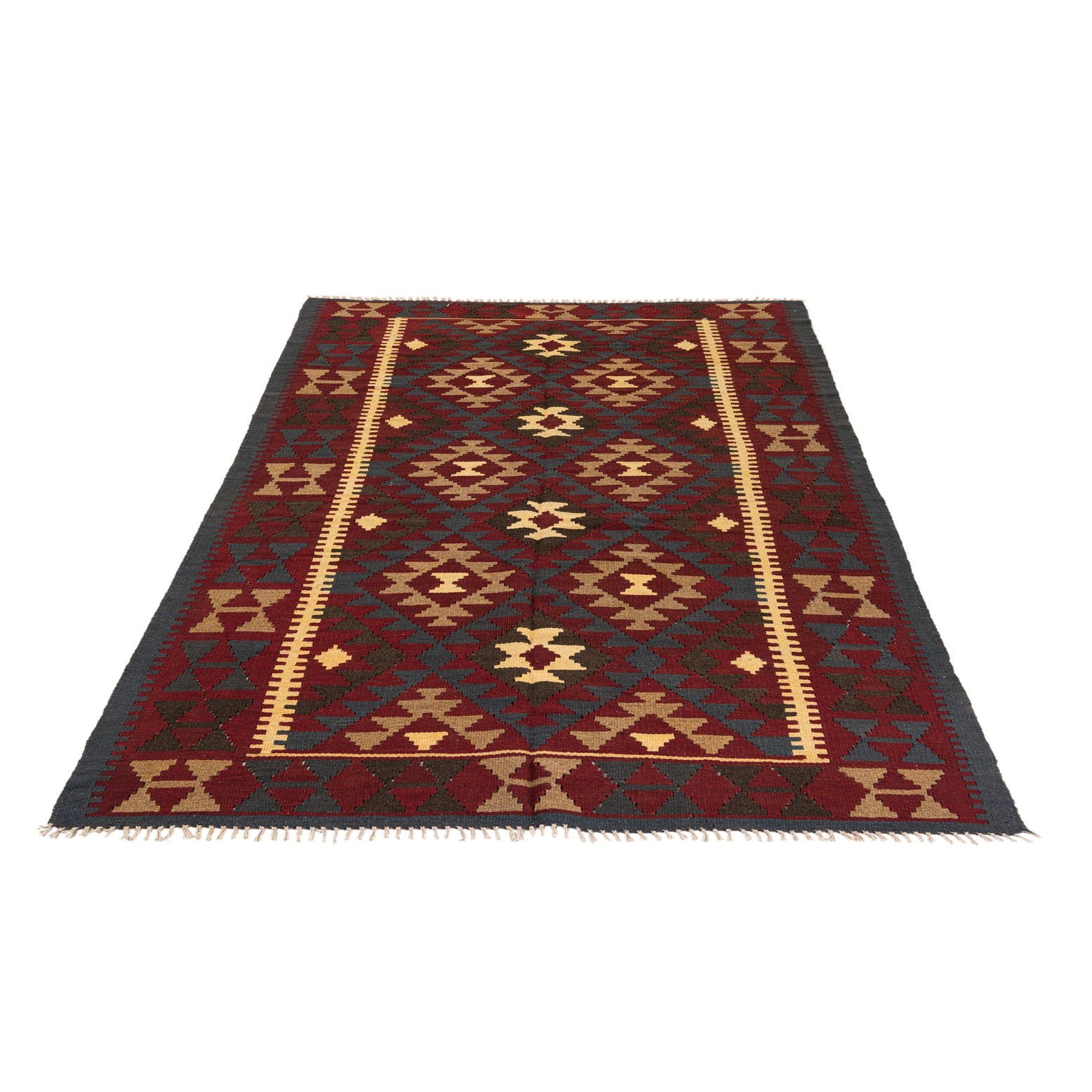 A 5x8 rectangular Kilim Maymana rug featuring a tribal pattern in shades of red, blue, and gold, with a flatweave texture.