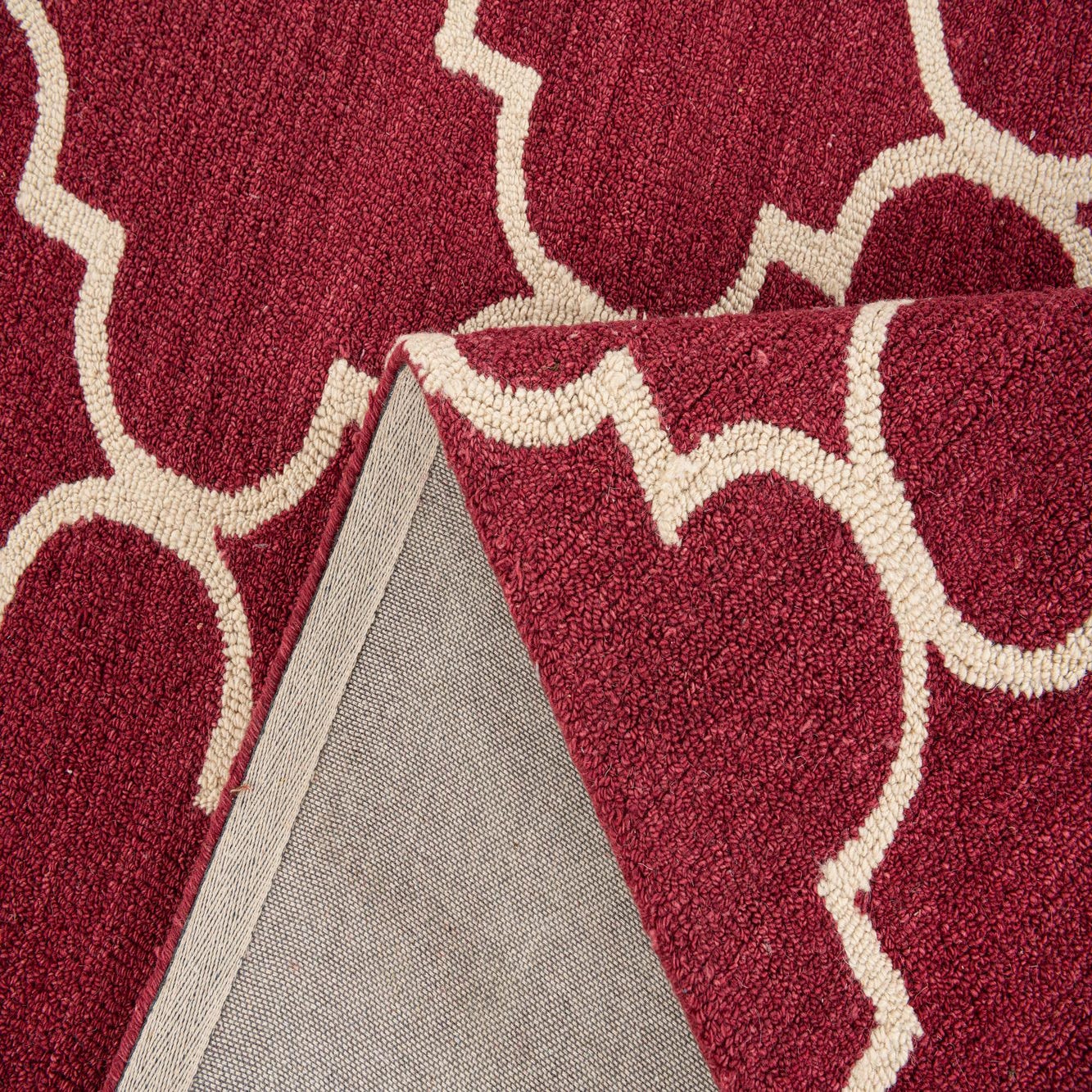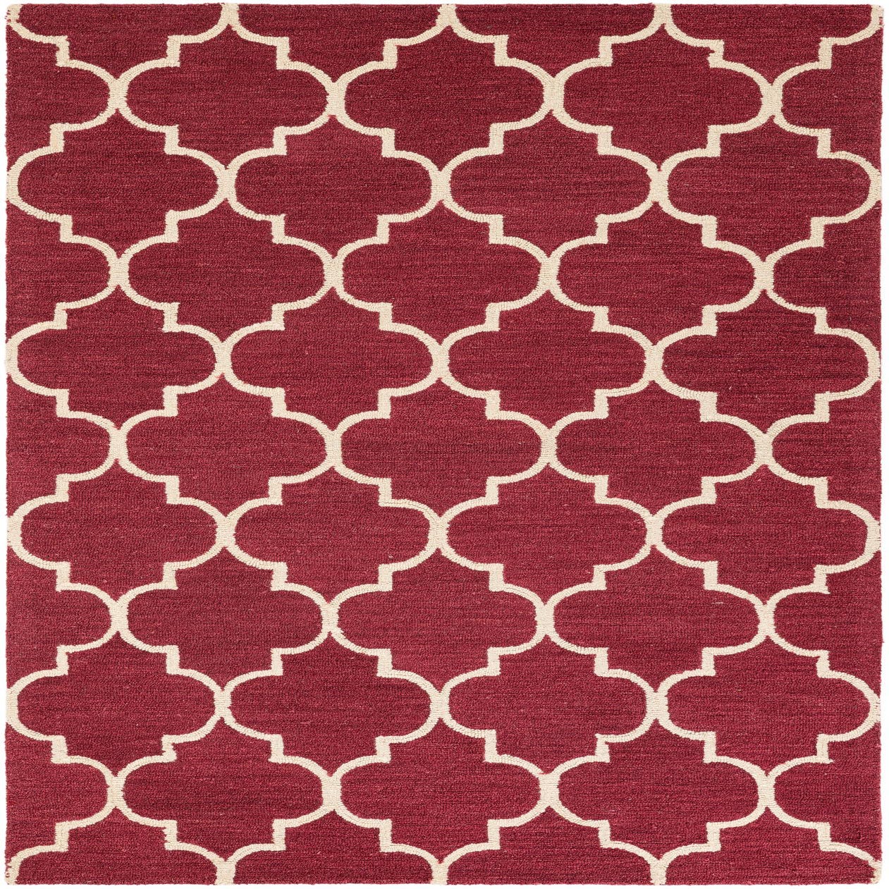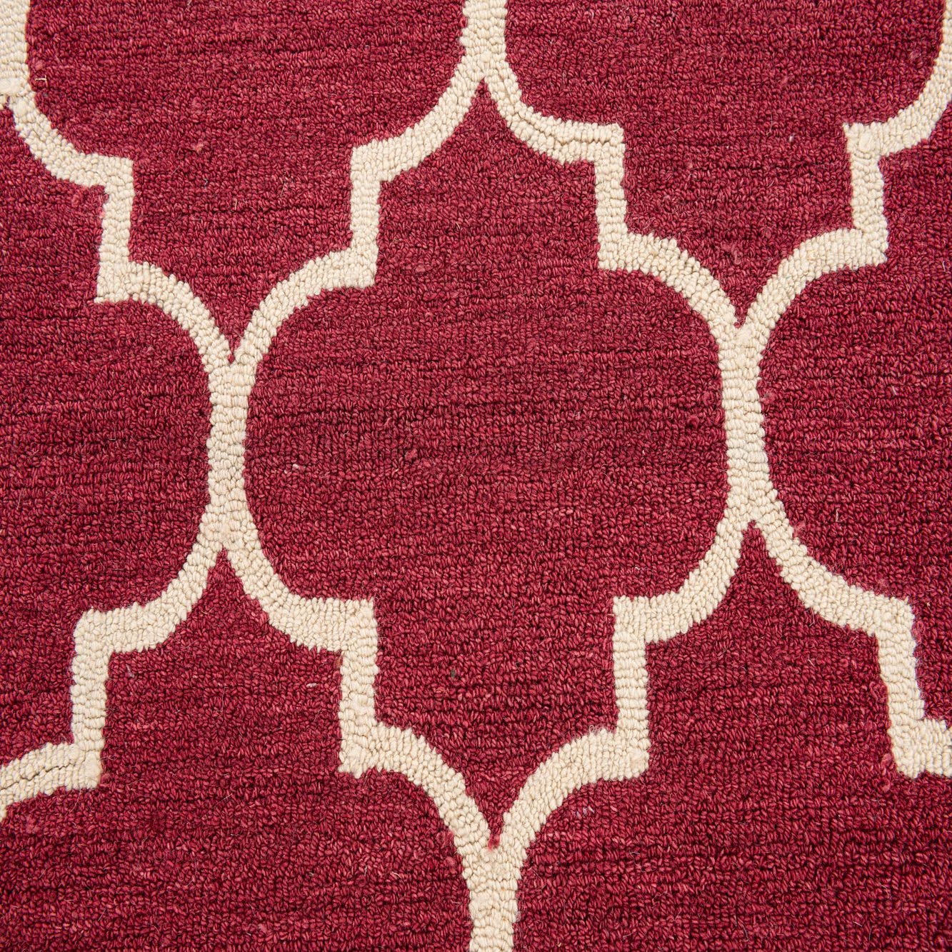A 5x8 rectangular red wool rug featuring a repeating modern quatrefoil pattern in cream, suitable for a living room.