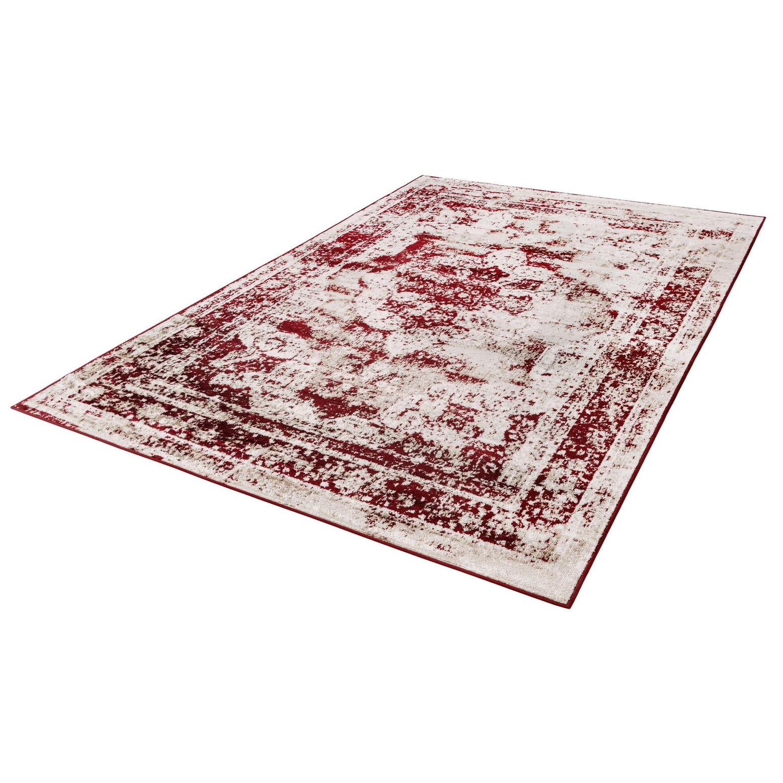 This rug showcases a dynamic abstract pattern with a distressed look, providing a modern twist to a traditional color palette. The interplay between the deep burgundy tones and the lighter accents create a striking focal point, making it a versatile addition to any room.