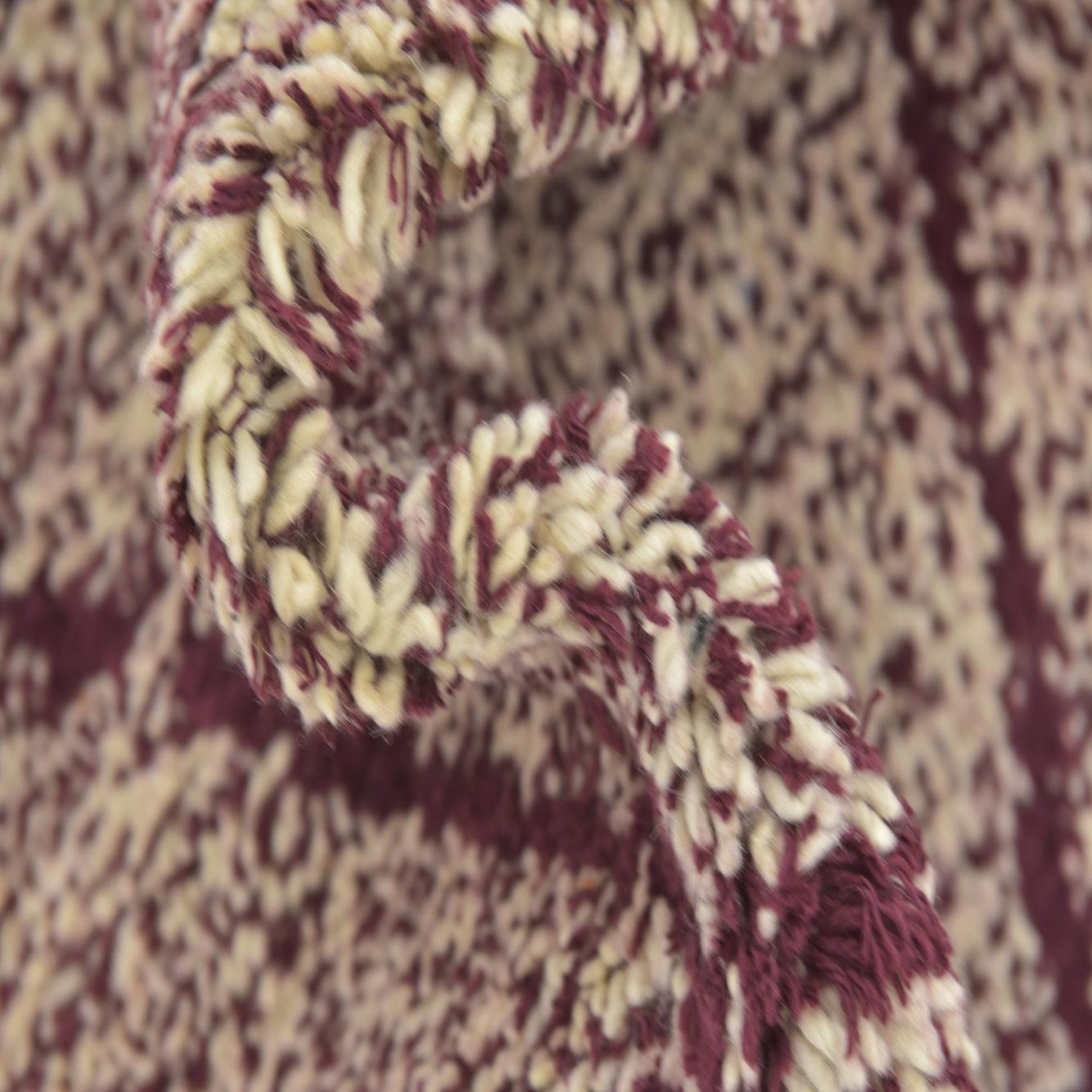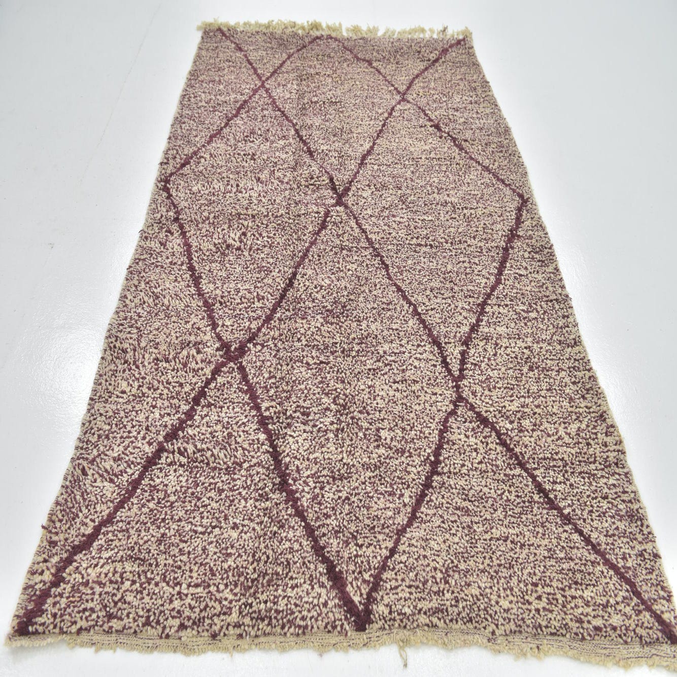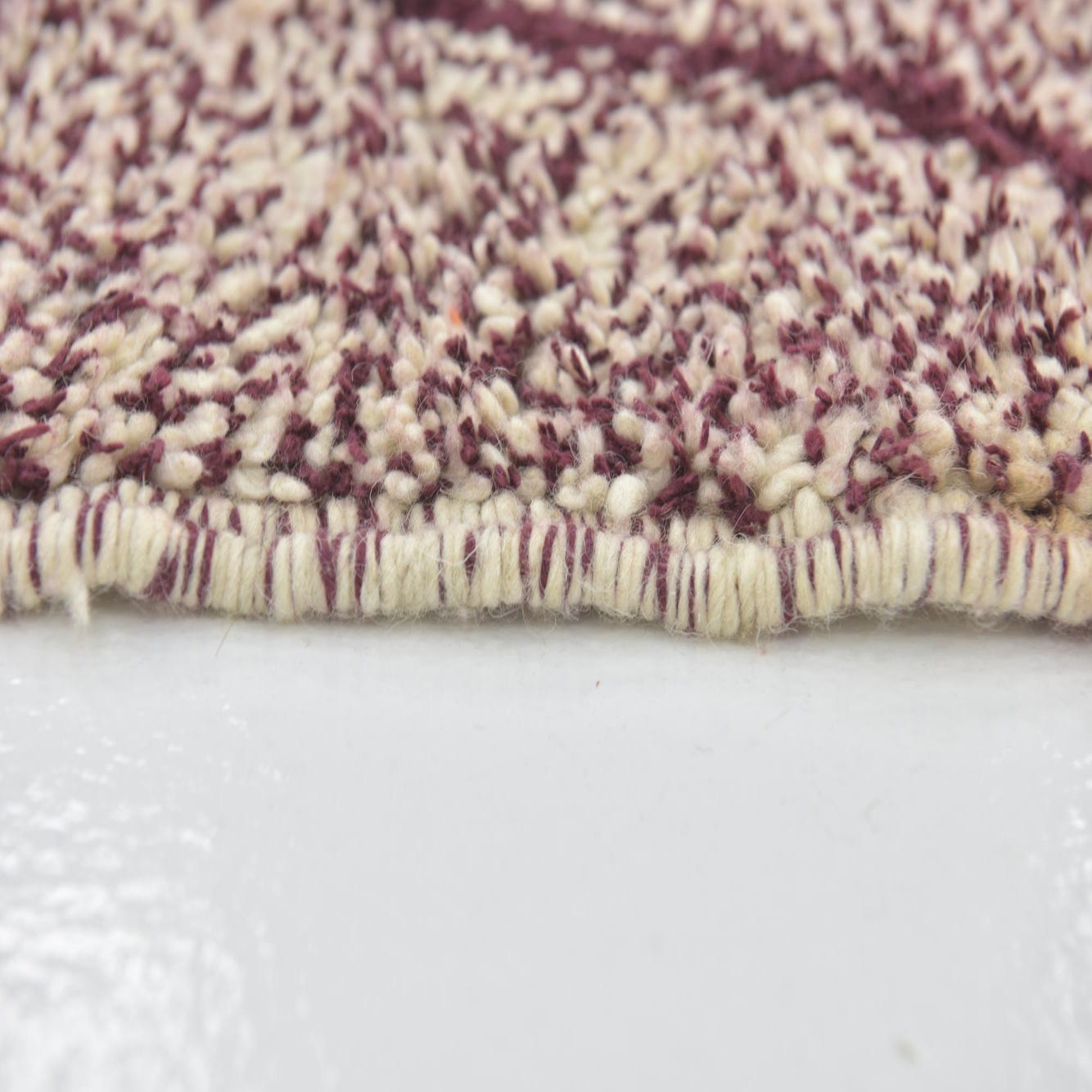 The semi-antique status of the rug, estimated to be 40-60 years old, offers a glimpse into the heritage and timeless style of Moroccan artisanship. Its colors, burgundy and ivory, are versatile and can anchor spaces with a touch of sophistication. The rug's understated design allows it to complement a variety of interior settings, from contemporary urban living spaces to more traditional and eclectic environments. It can serve as a focal point in a minimalist setting or blend harmoniously with more ornate furnishings. The rug's proportions make it an ideal choice for small to mid-sized rooms, creating an intimate and cozy ambiance.