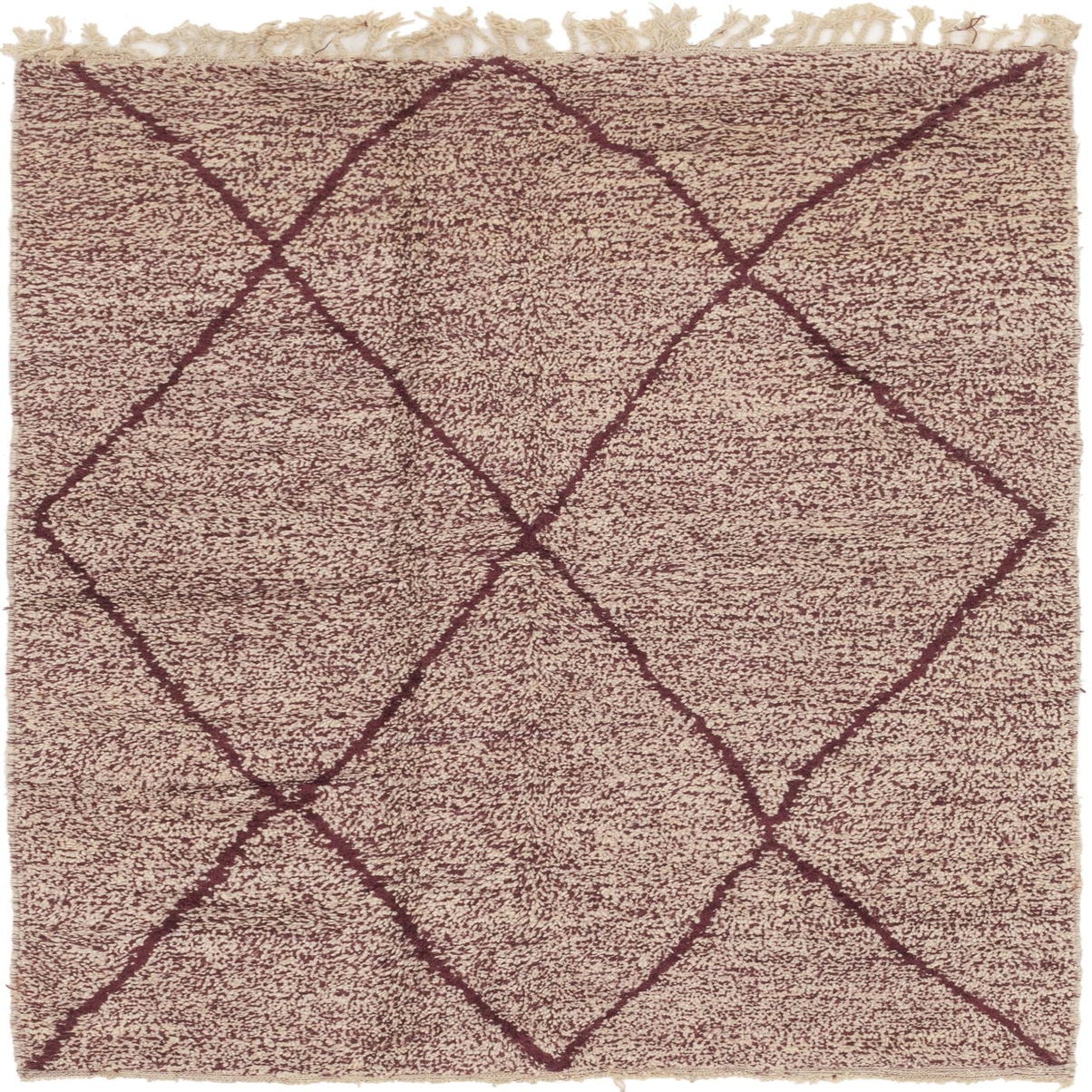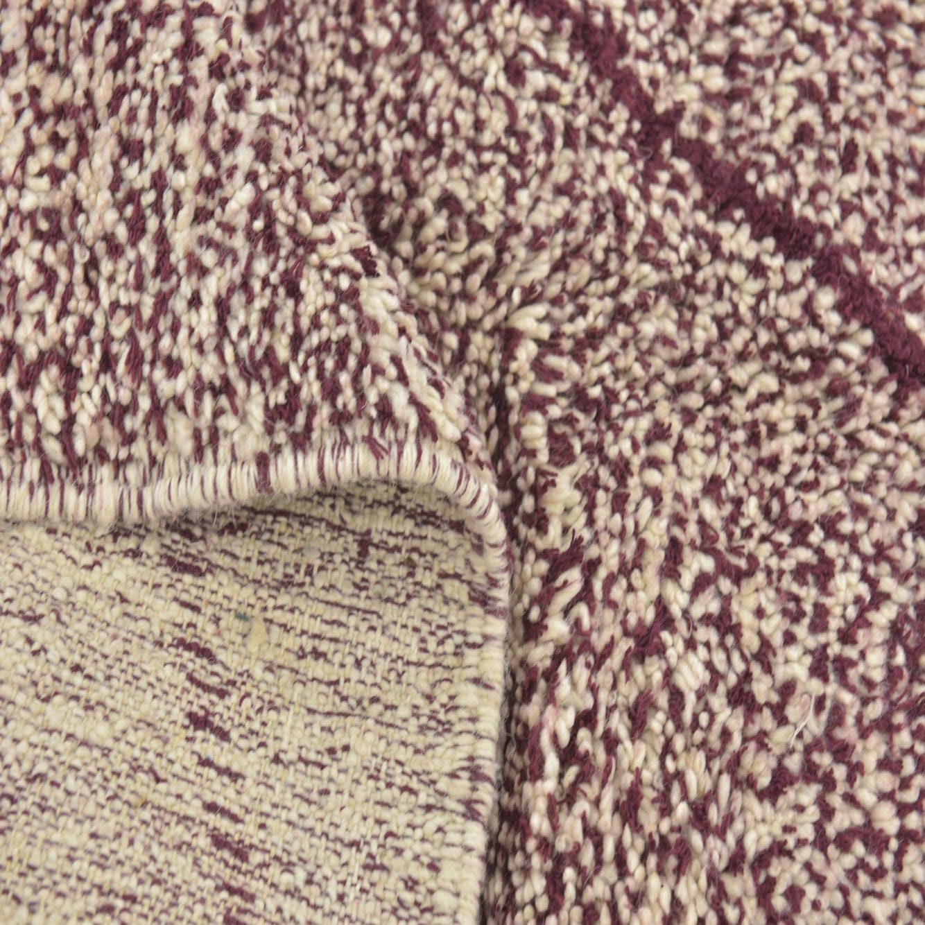 This Moroccan collection 5x8 rug is hand-knotted from 100% wool and showcases the enduring craftsmanship of traditional techniques. With a rich burgundy background, the rug features a simplistic ivory geometric pattern. The texture of the rug is inviting, reflecting the natural qualities of wool which provides both warmth and durability. The piece also features fringe detailing that adds to its authentic Moroccan aesthetic.
