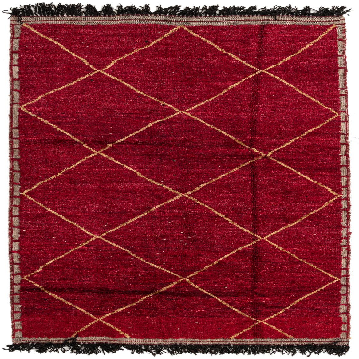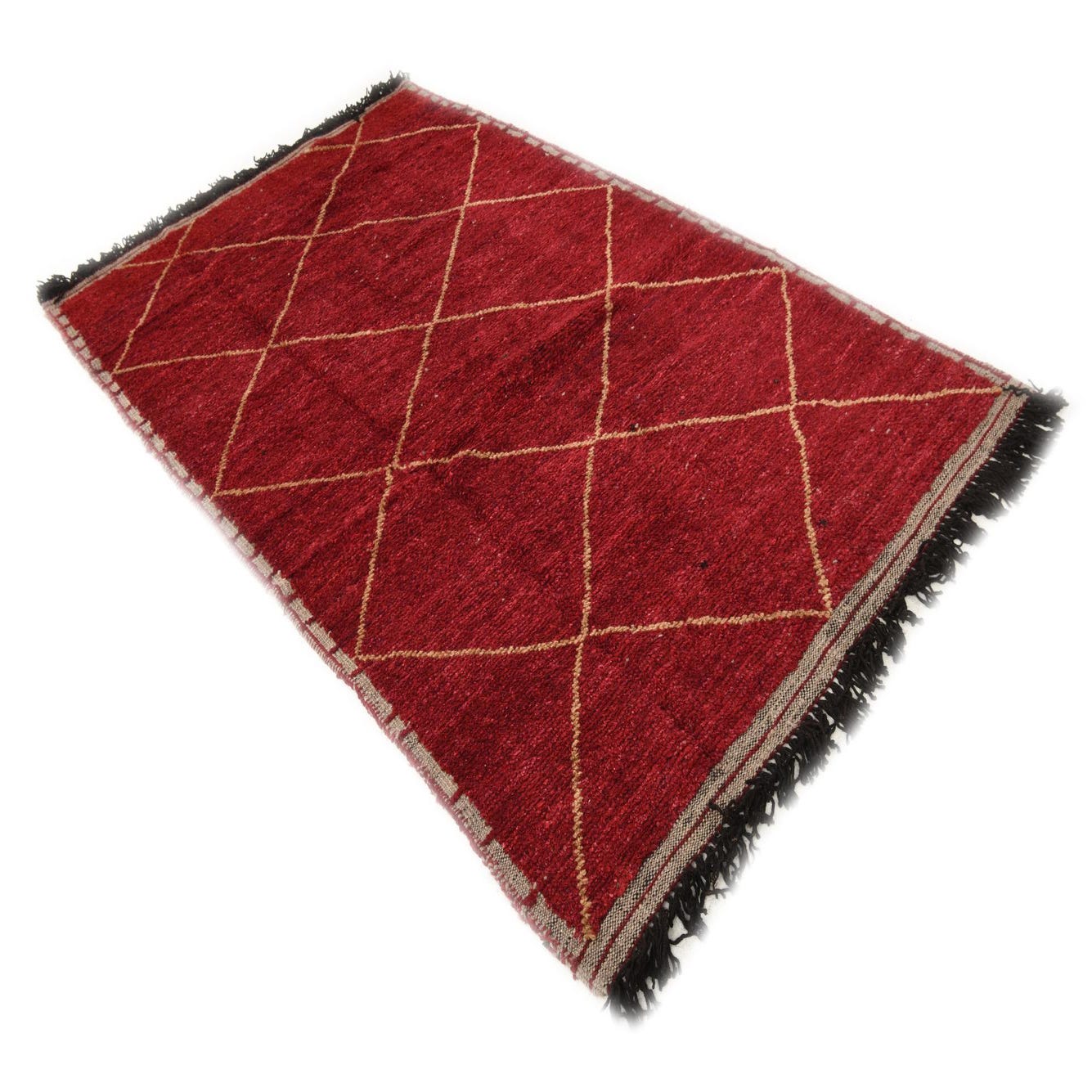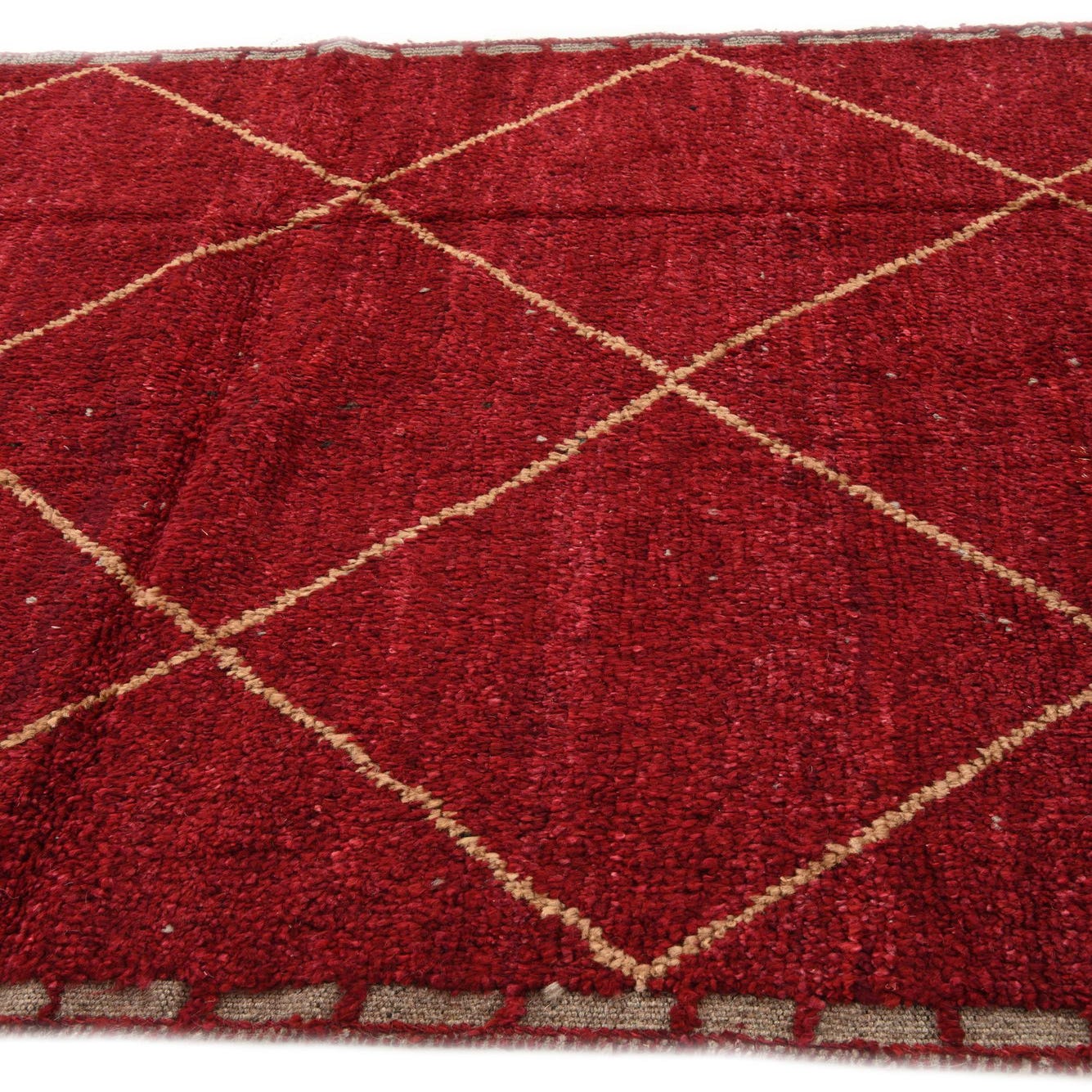 This Moroccan collection rug is a hand knotted 5x8 piece crafted from 100% wool, showcasing a deep burgundy background with a striking geometric pattern in hues of gold and black. The bold diamond motifs create a dynamic visual that draws the eye, while the gold outlines bring a subtle shimmer effect to the design. The rug's fringe adds a traditional touch, while the rich, saturated color palette evokes a sense of warmth and sophistication.