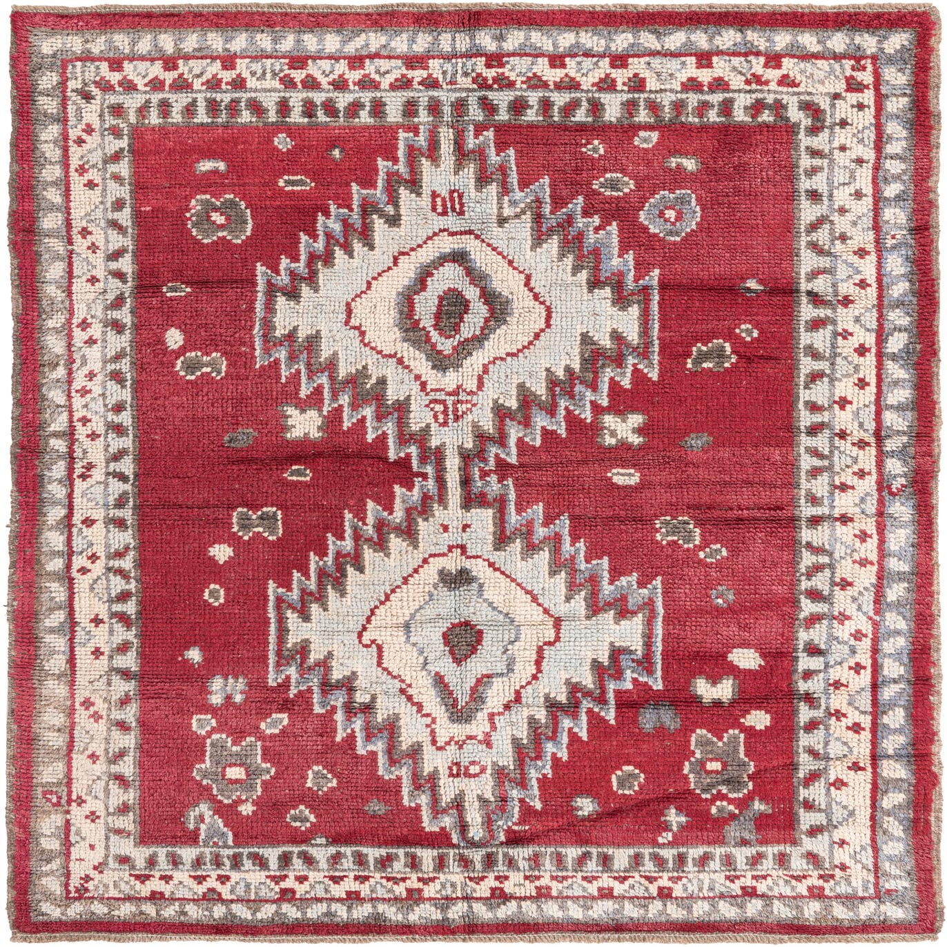 A 5x8 rectangular red Oushak wool rug with a modern medallion pattern in cream, gray, and light blue.