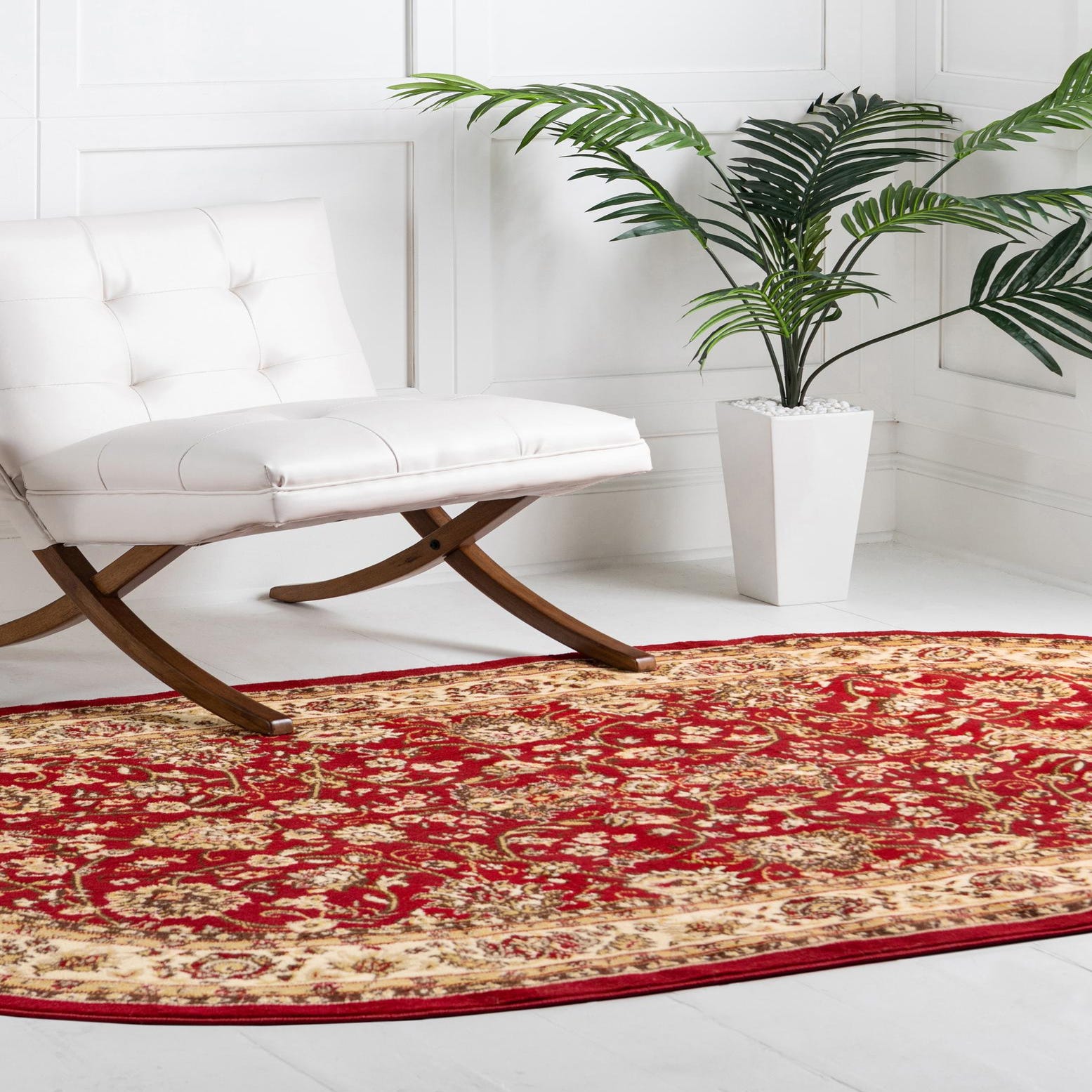 The Yasmin collection presents an elegant 5x8 oval rug, machine-woven from 100% polypropylene, known for its durability and longevity. With a dominant burgundy background, the design incorporates a harmonious blend of beige, brown, and cream accents. The rug displays a classic ornamental pattern featuring intricate florals and scrollwork that confer a sense of timeless sophistication. The edges are neatly finished, and the rug's overall smooth and refined texture compliments its visual appeal.
