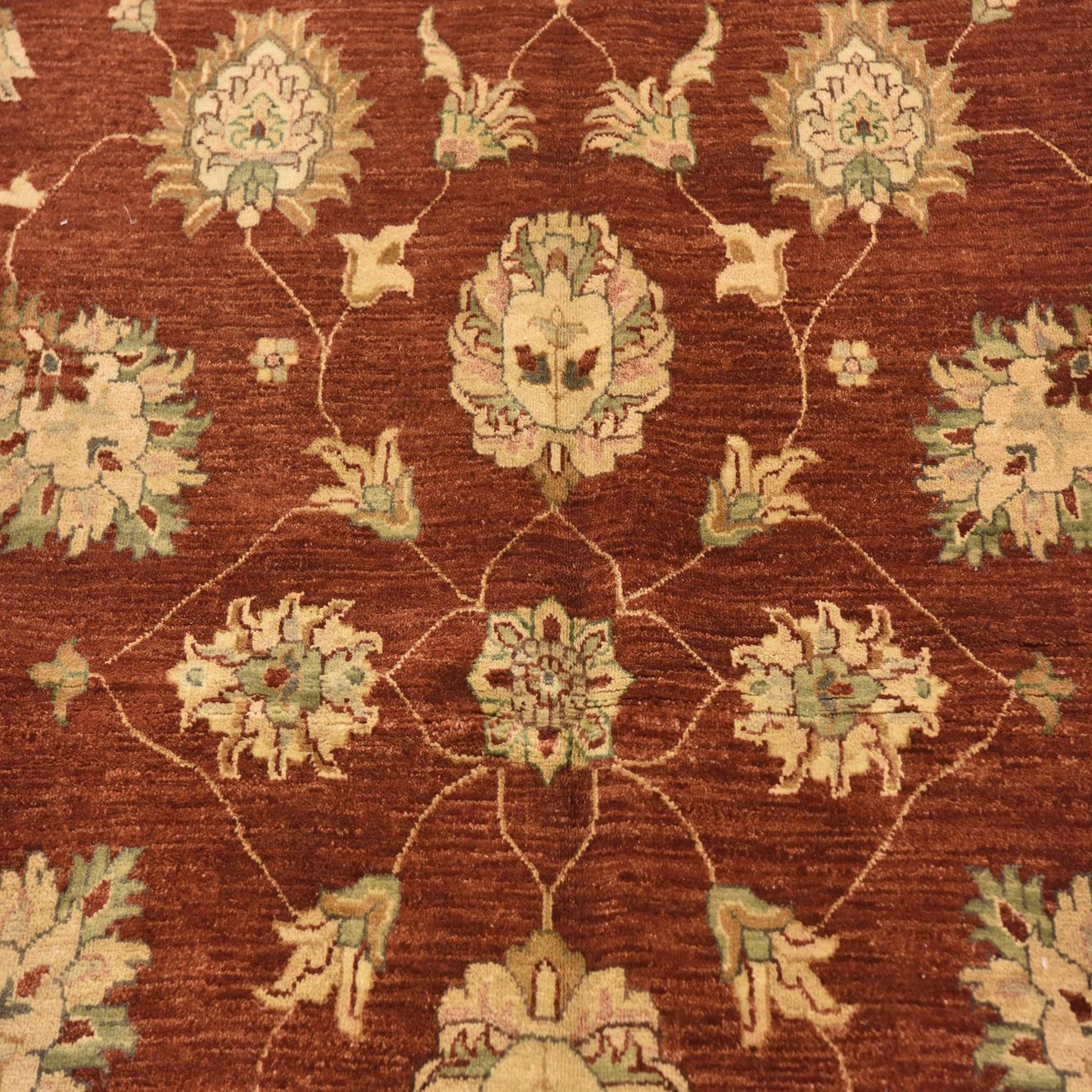 A 5x8 rectangular Peshawar Ziegler rug in traditional red with an ornate botanical and floral pattern and a cream border.
