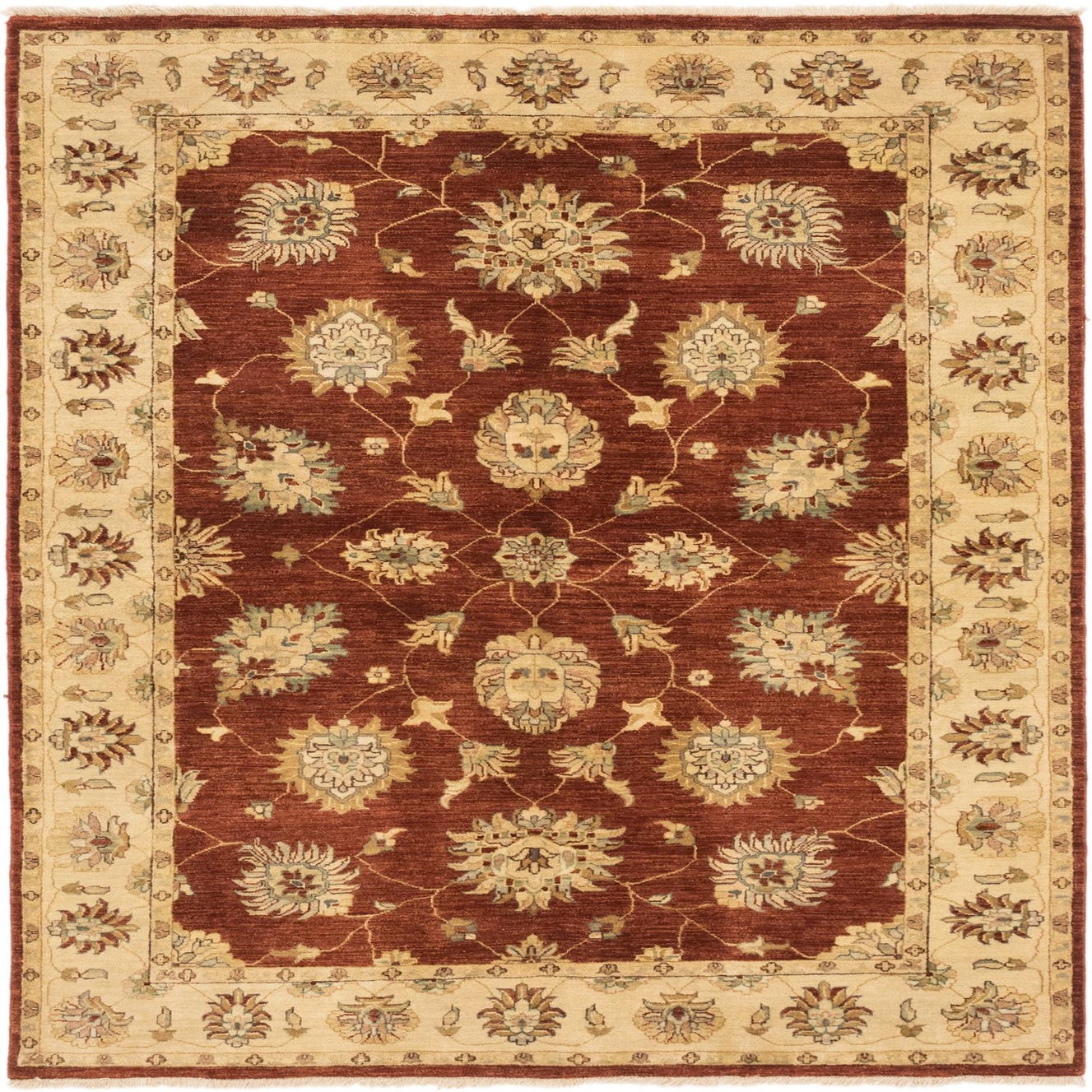 Primary color is Burgundy. Colors in this rug include: Burgundy, Beige, Gray, Green, Light Blue, Olive, Tan.