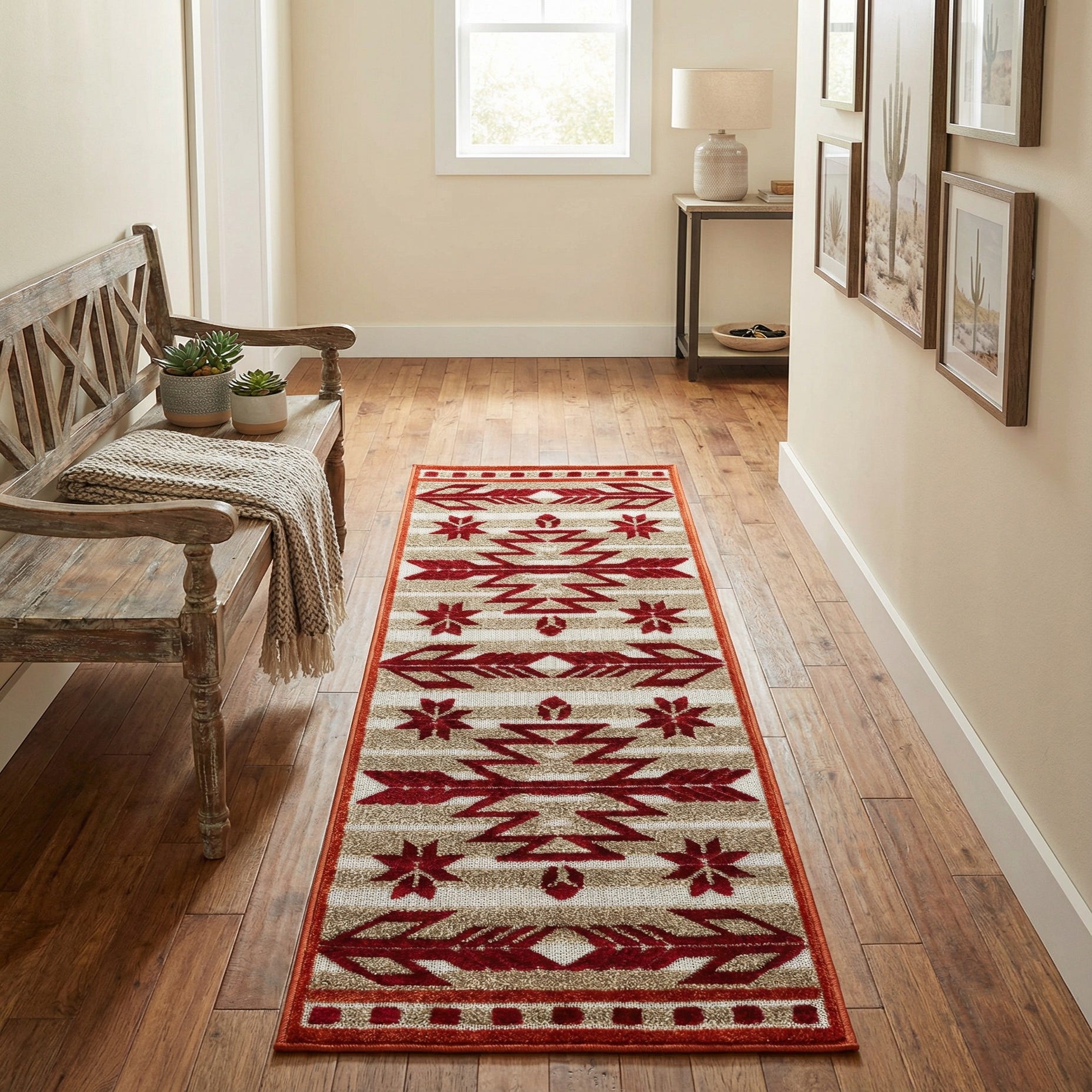 This runner works well in a narrow hallway or entry, alongside a bed, or on a covered porch where a touch of pattern and color helps ground the space. Pair it with warm wood tones, leather seating and woven textiles for a layered, rustic or Southwestern-inspired look, or use it to bring depth to neutral, transitional interiors and eclectic, boho rooms.