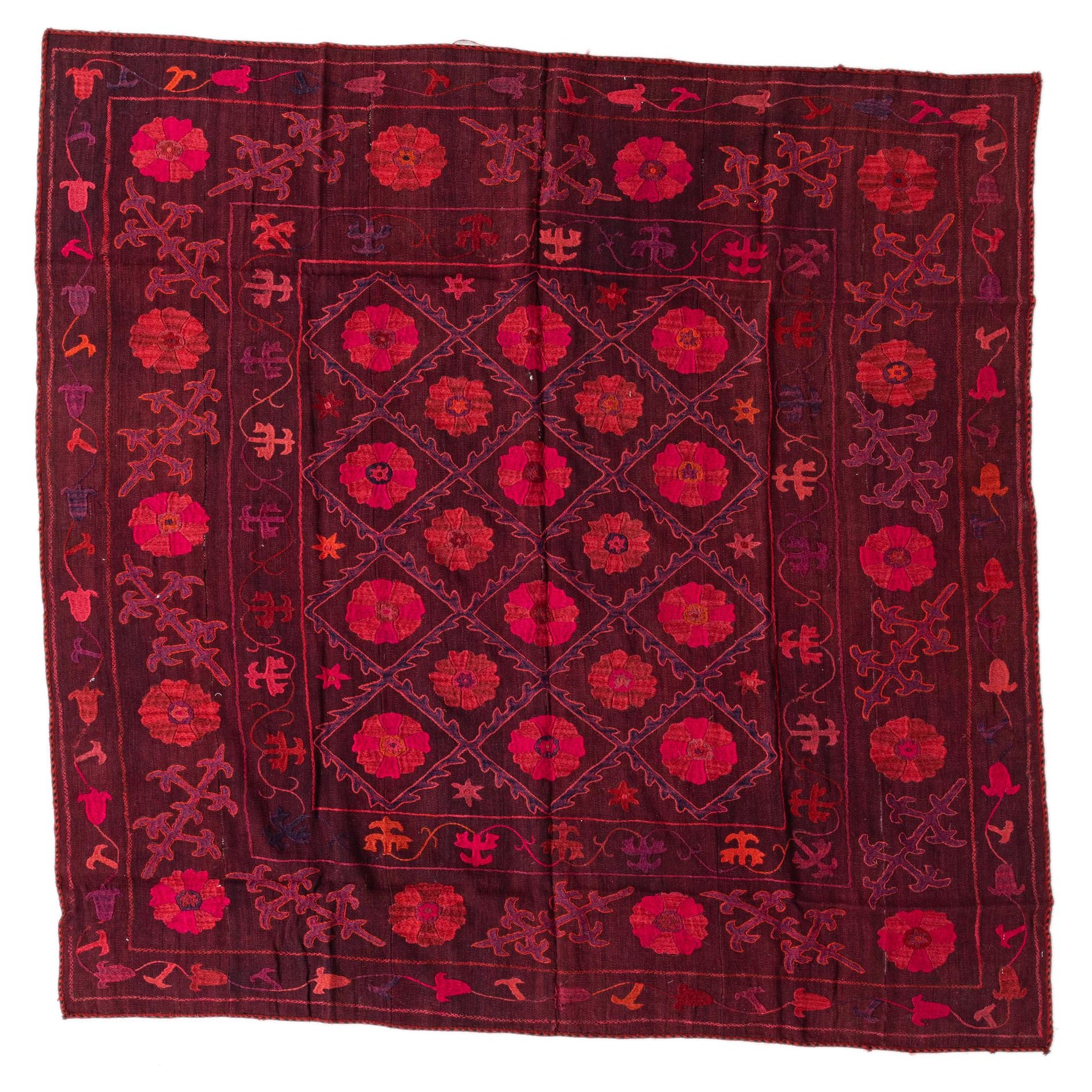 A square 6' 4 x 6' 7 red tribal wool rug with a central floral medallion pattern and a decorative border.