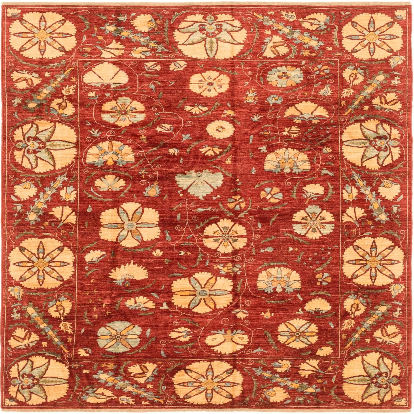 A 6x9 rectangular Ariana Ziegler rug in deep red with an intricate tribal floral pattern in cream, light blue, and green.