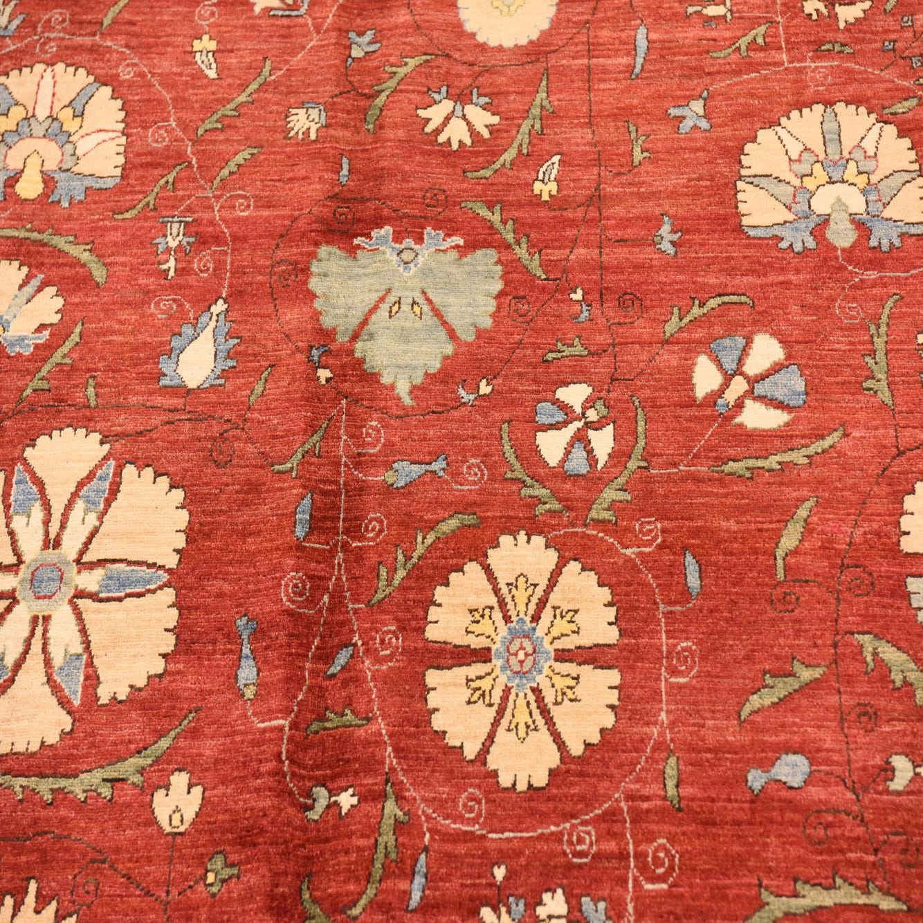 A 6x9 rectangular Ariana Ziegler rug featuring a rich red field with large, intricate floral and medallion patterns in cream, blue, and green.