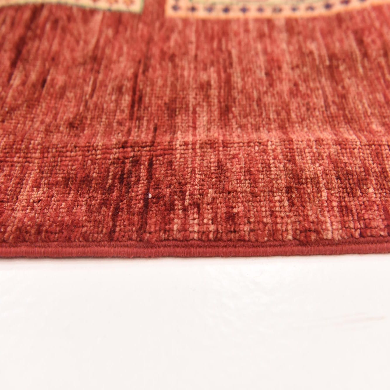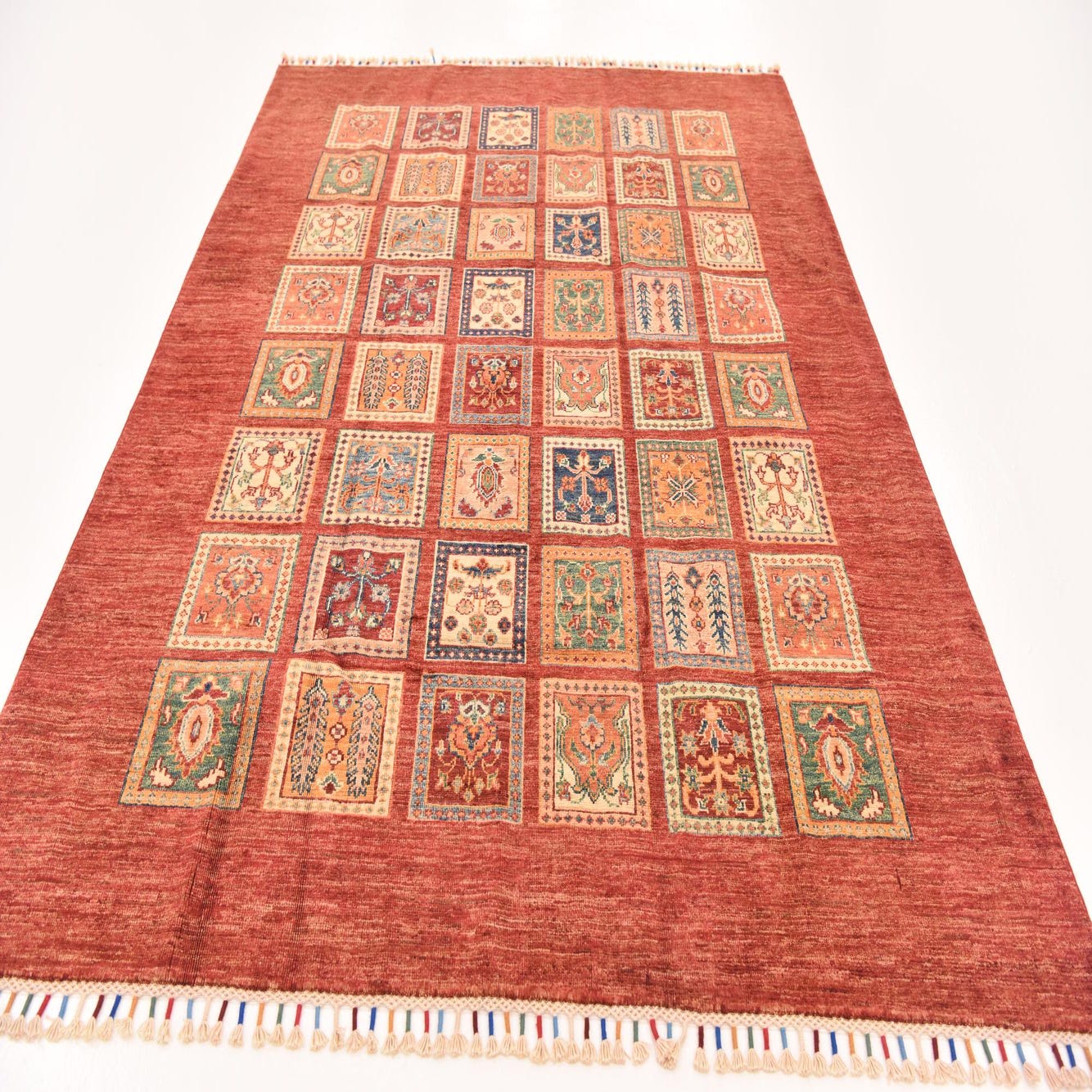 A 6x9 rectangular Ariana Ziegler rug featuring a rich red border and a grid of colorful Southwestern and Oriental motifs.