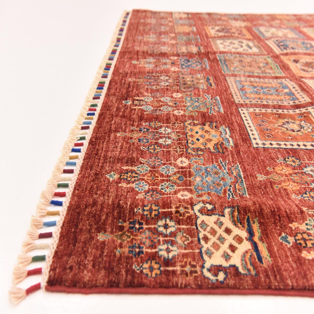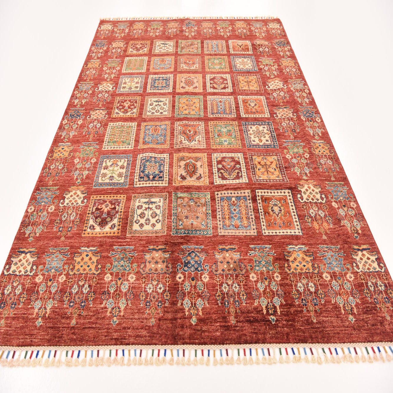 A 6x9 rectangular Rugs.com Ariana Ziegler rug featuring a deep red field with a grid of multicolored Southwestern and Oriental squares, bordered by intricate patterns and white fringe.