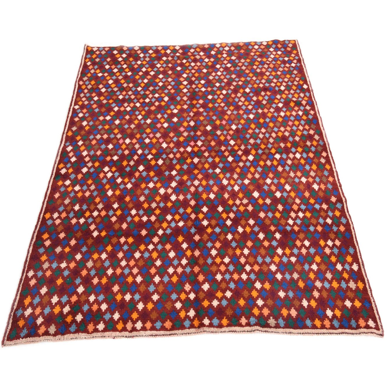 A 6x9 rectangular Balouch rug with a deep red background and a repeating tribal pattern of small, colorful diamond shapes in blue, orange, green, and white.