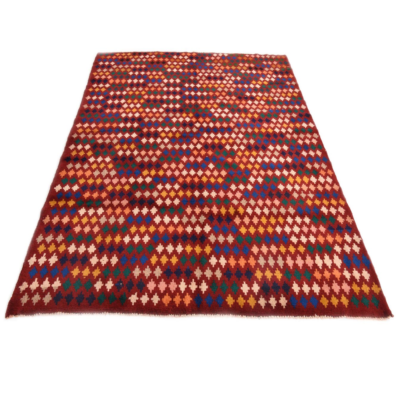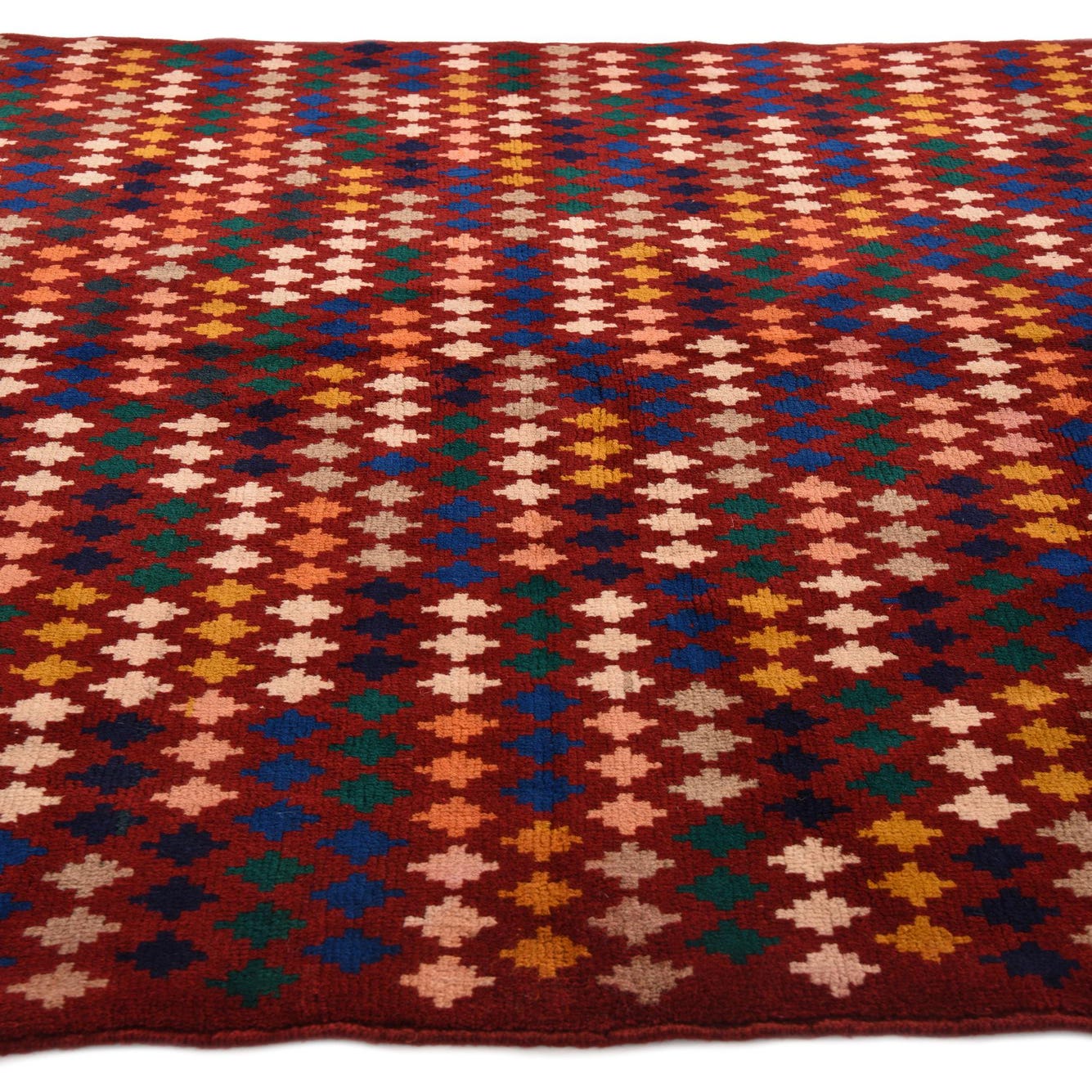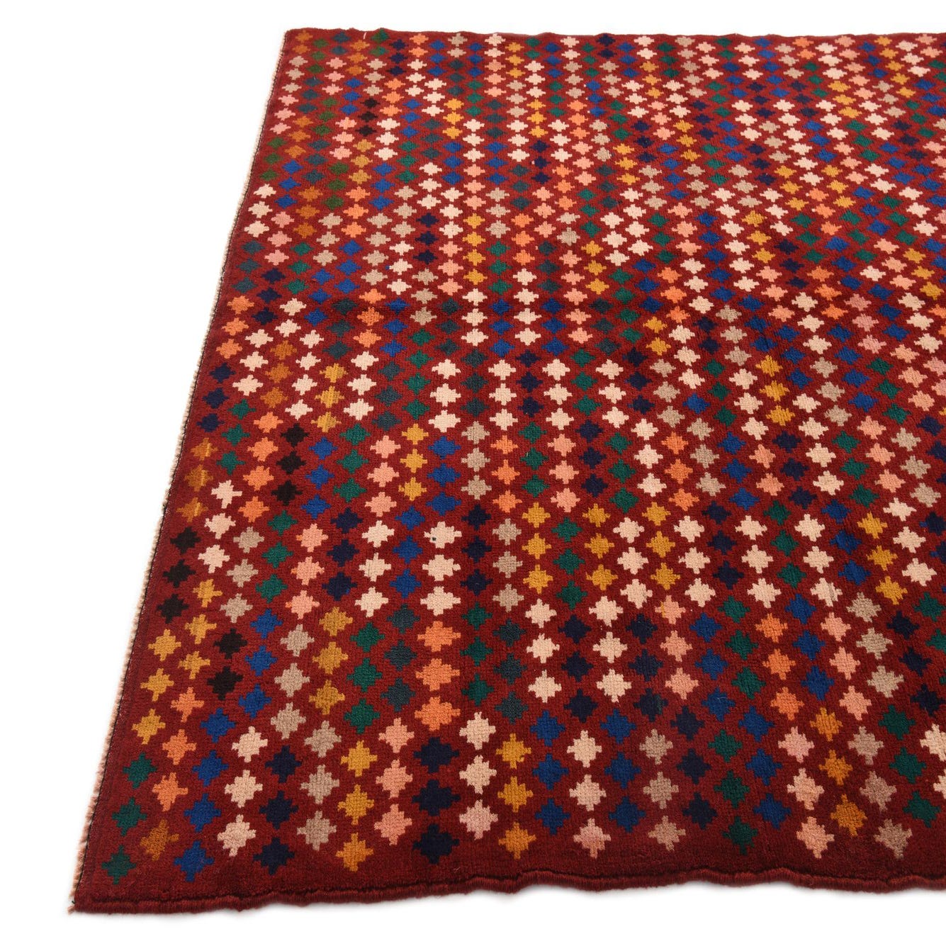 A 6x9 rectangular Balouch rug with a deep red background and a vibrant, multicolored tribal diamond pattern.