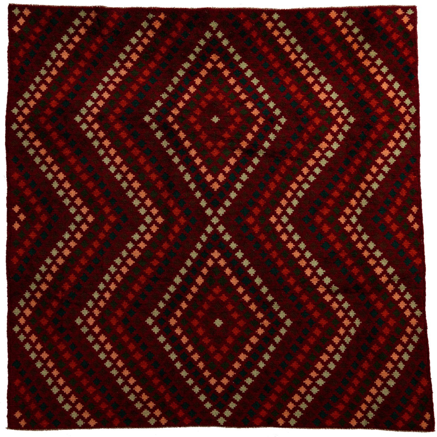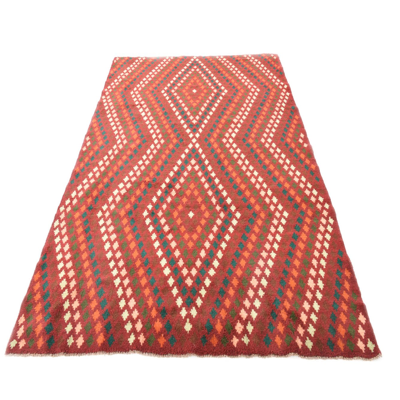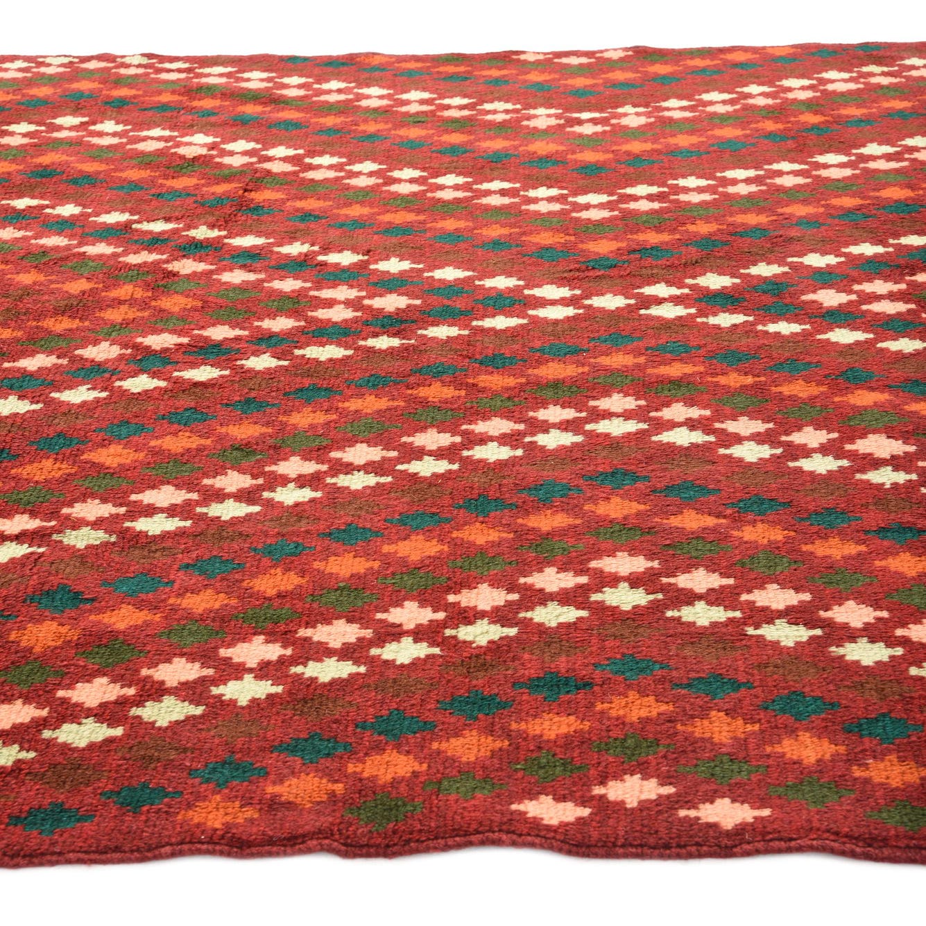 A 6x9 rectangular Balouch wool rug featuring a tribal geometric pattern of interlocking diamonds in various shades of red, orange, and green.