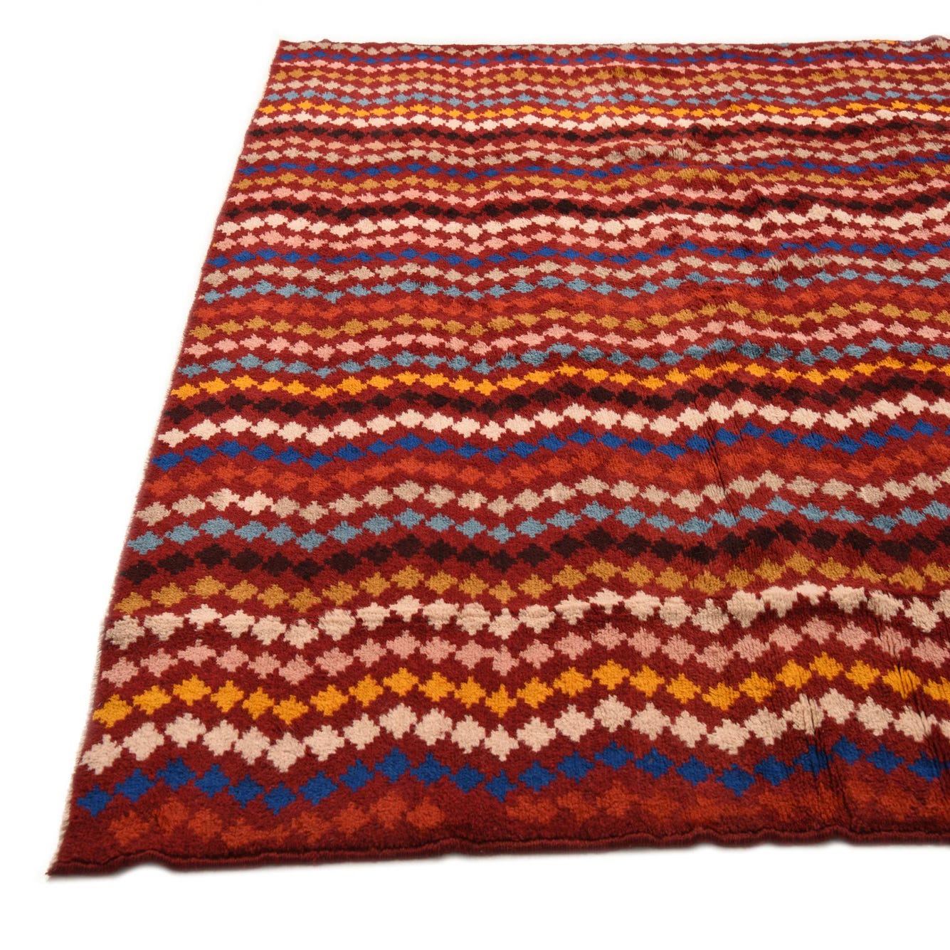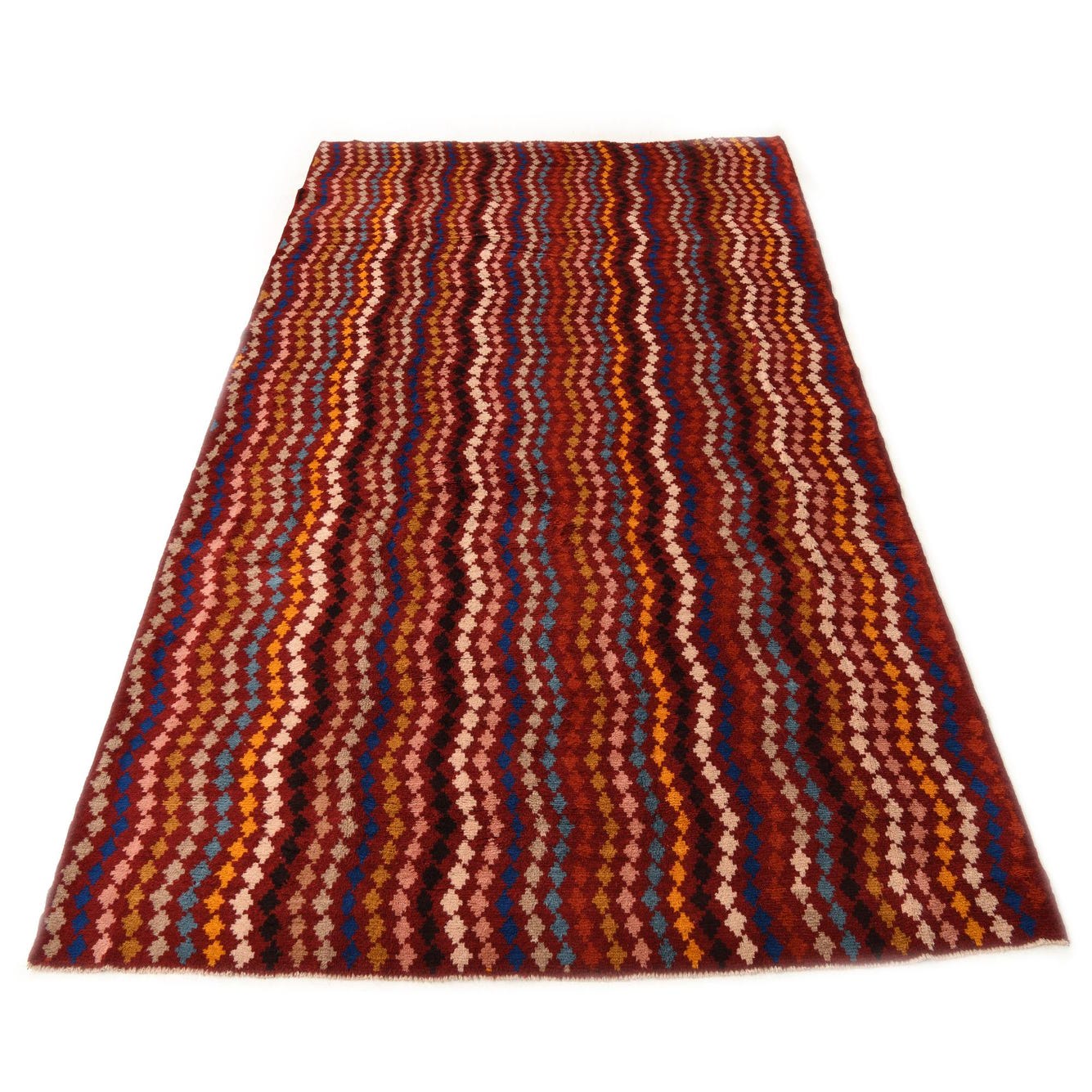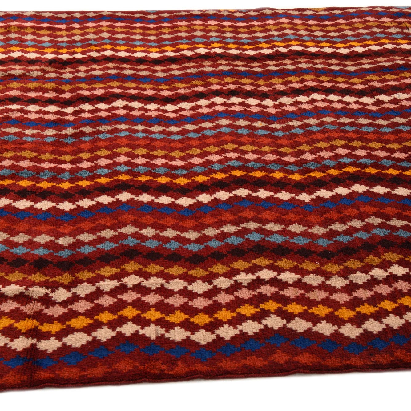 The Balouch rug showcases a captivating zigzag pattern across its hand-knotted wool construction, creating a dynamic and textured visual. The vivid background in rich burgundy is complemented by a diverse palette that includes black, blue, brown, maroon, orange, and yellow, offering warmth and versatility for a variety of settings. The quality craftsmanship of this 6x9 piece ensures durability and a substantial feel underfoot.