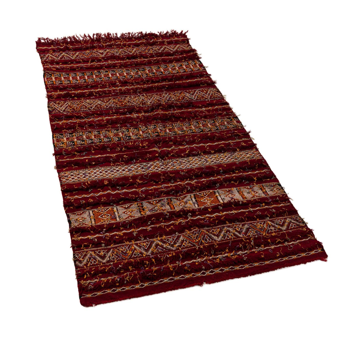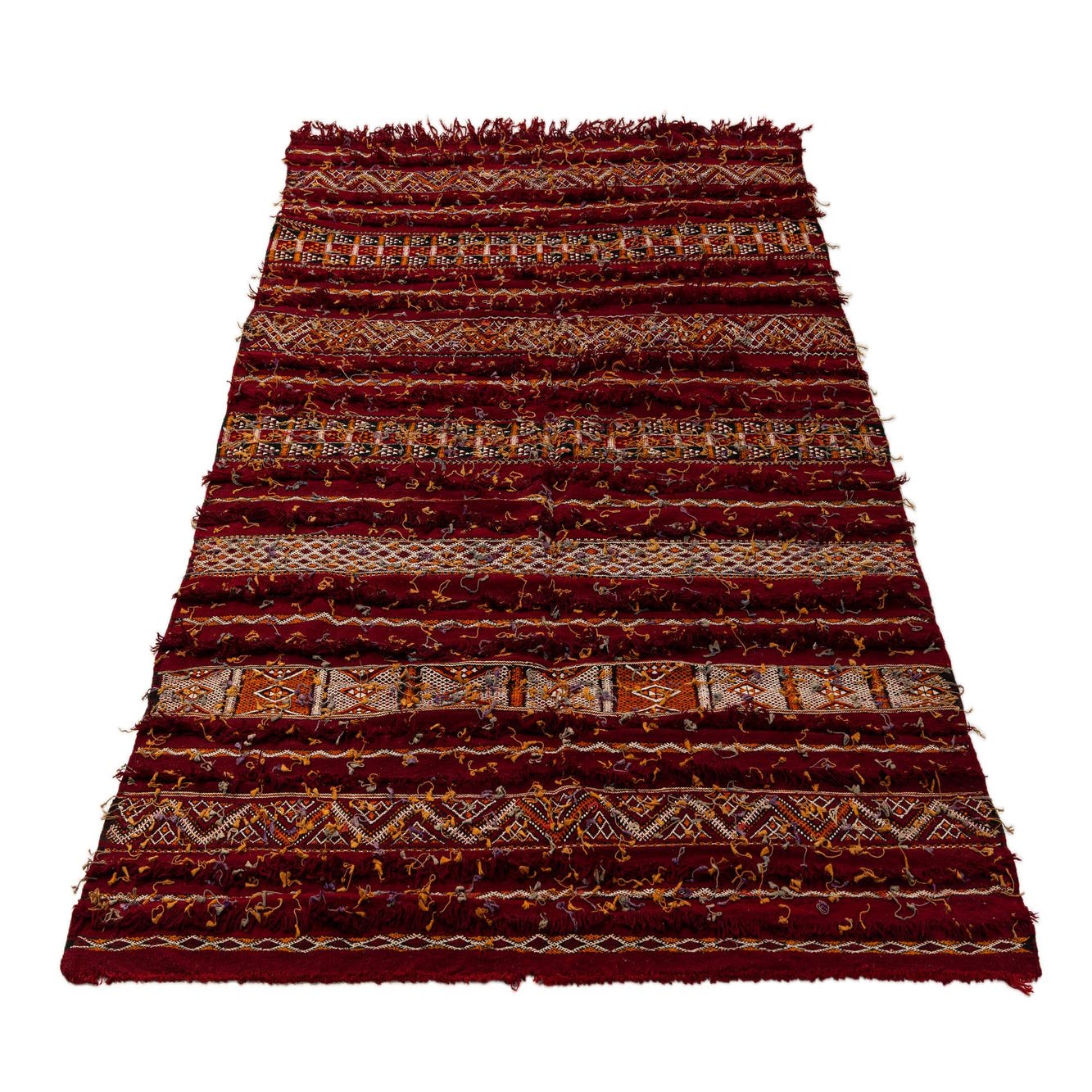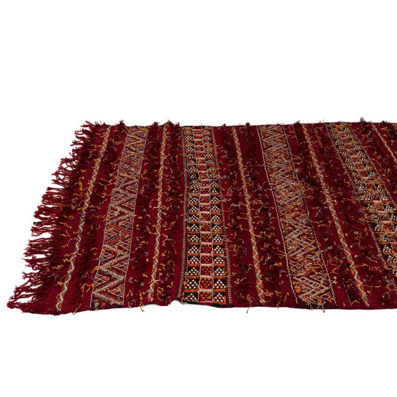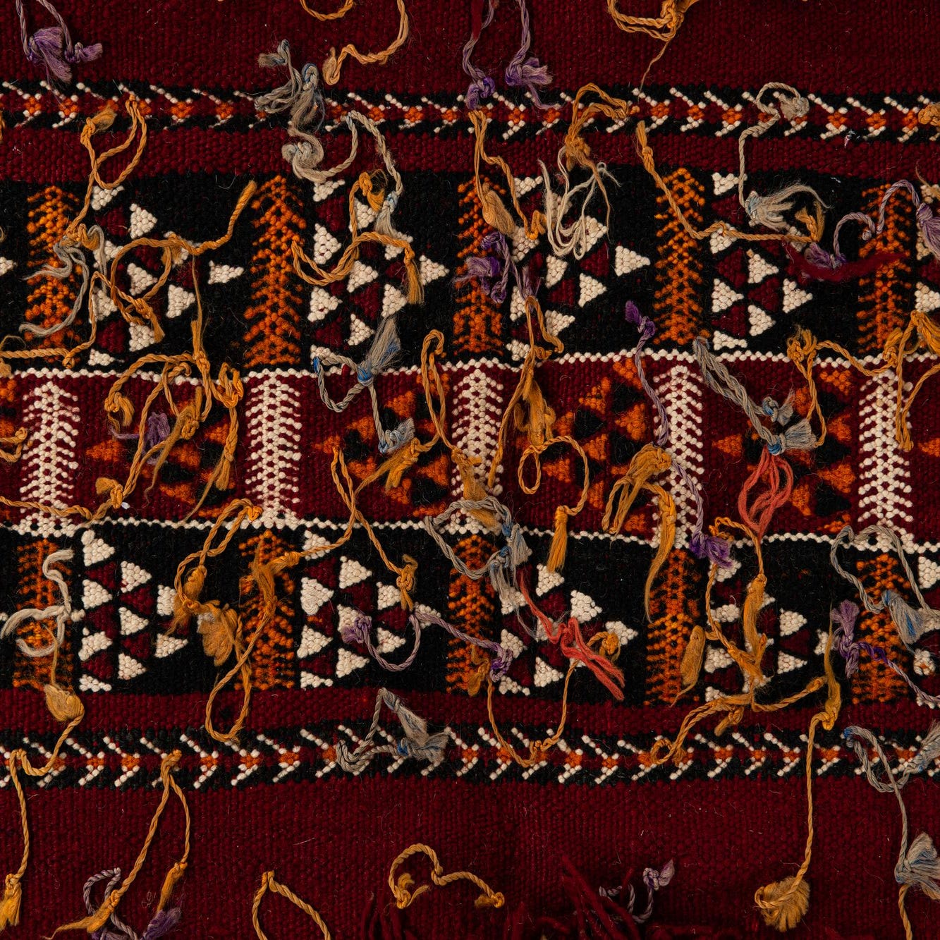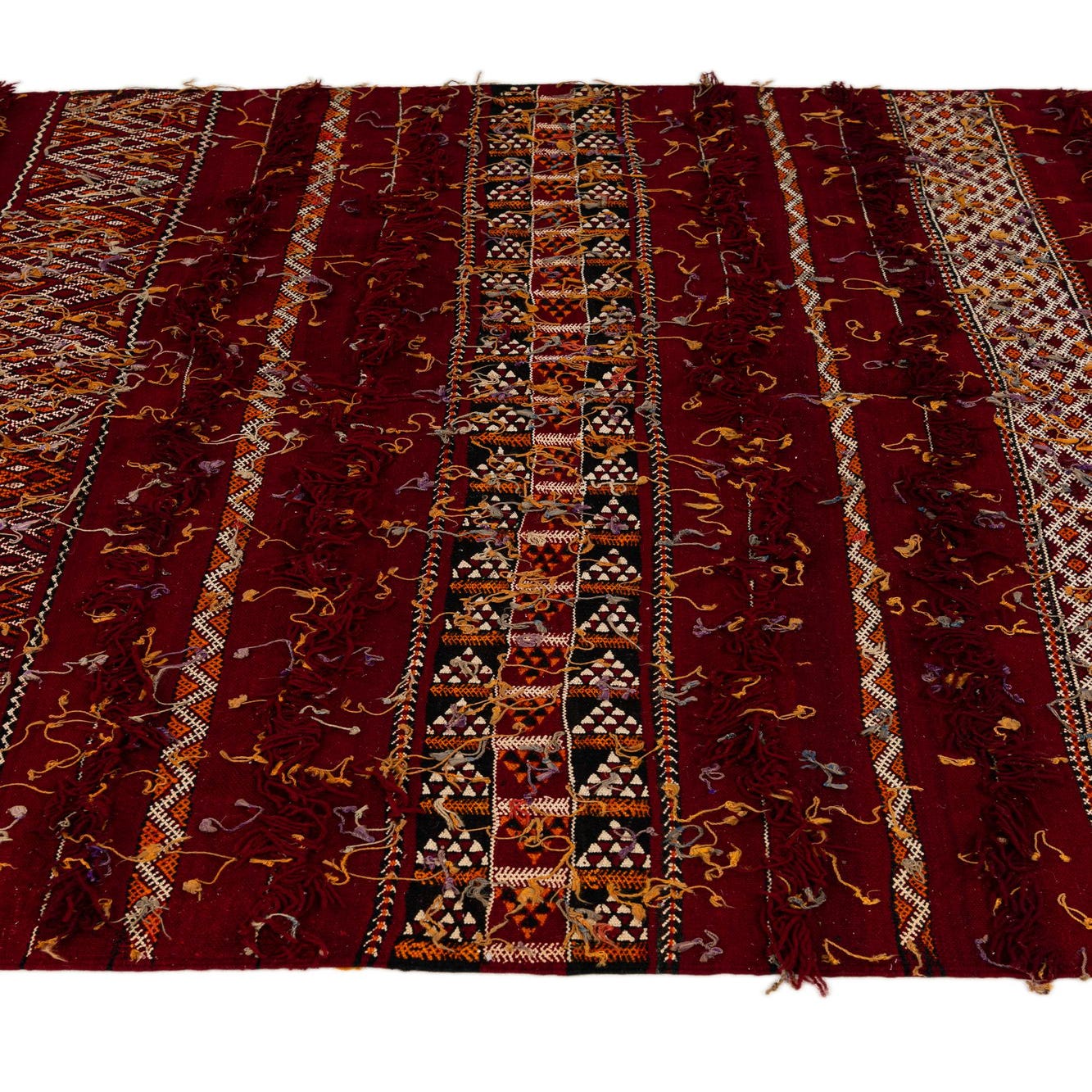 A 6x9 rectangular red wool shag rug with Southwestern and tribal patterns, featuring stripes of white, orange, and black geometric designs.