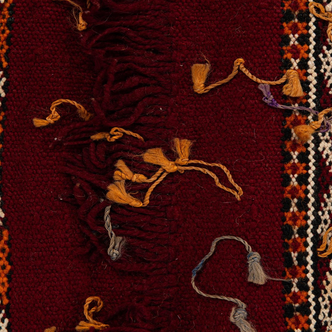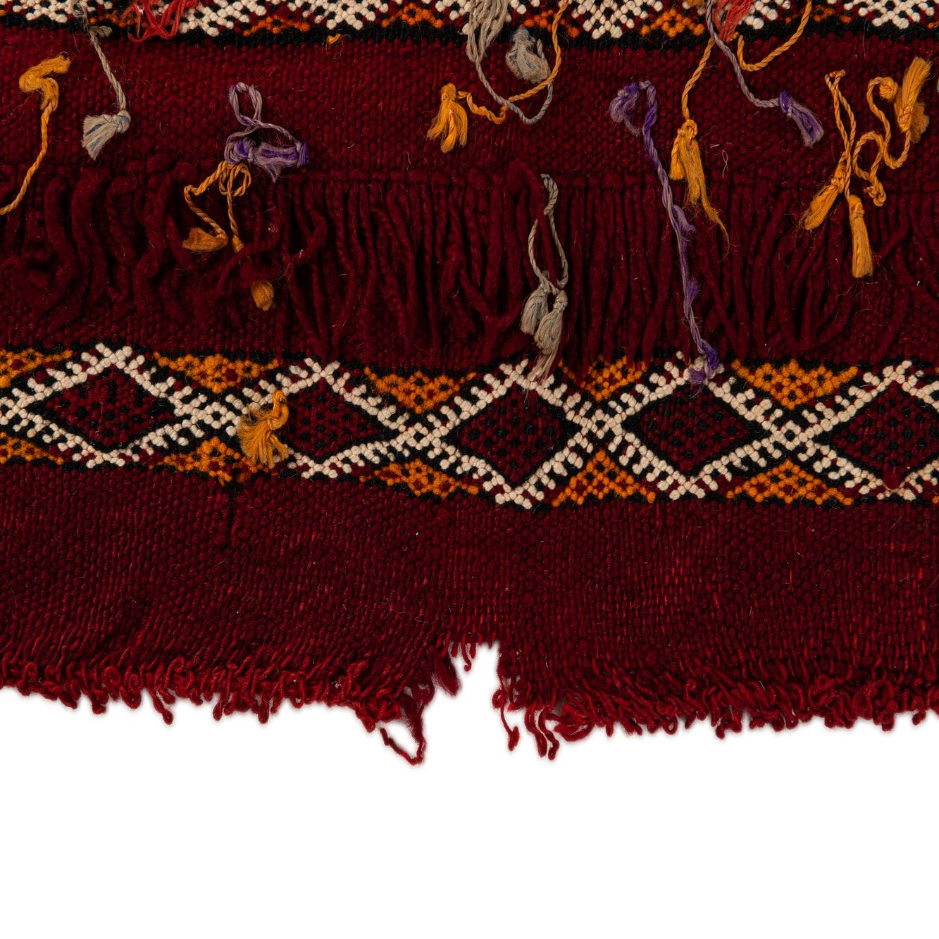 Primary color is Burgundy. Colors in this rug include: Burgundy, Ivory, Orange, Black, Gold, Purple.