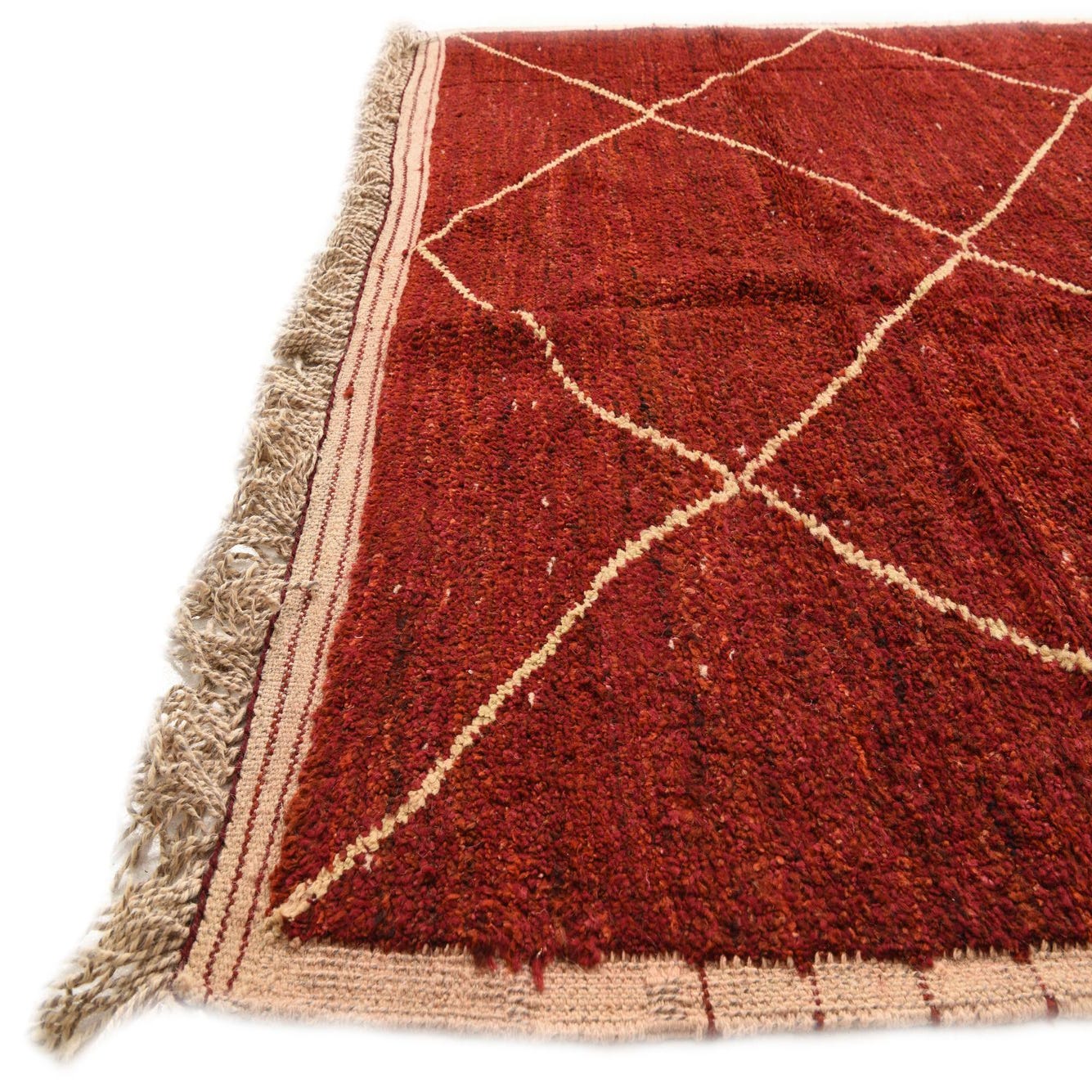 A 6x9 rectangular red shag rug with a cream diamond pattern and fringed ends, ideal for a living room.