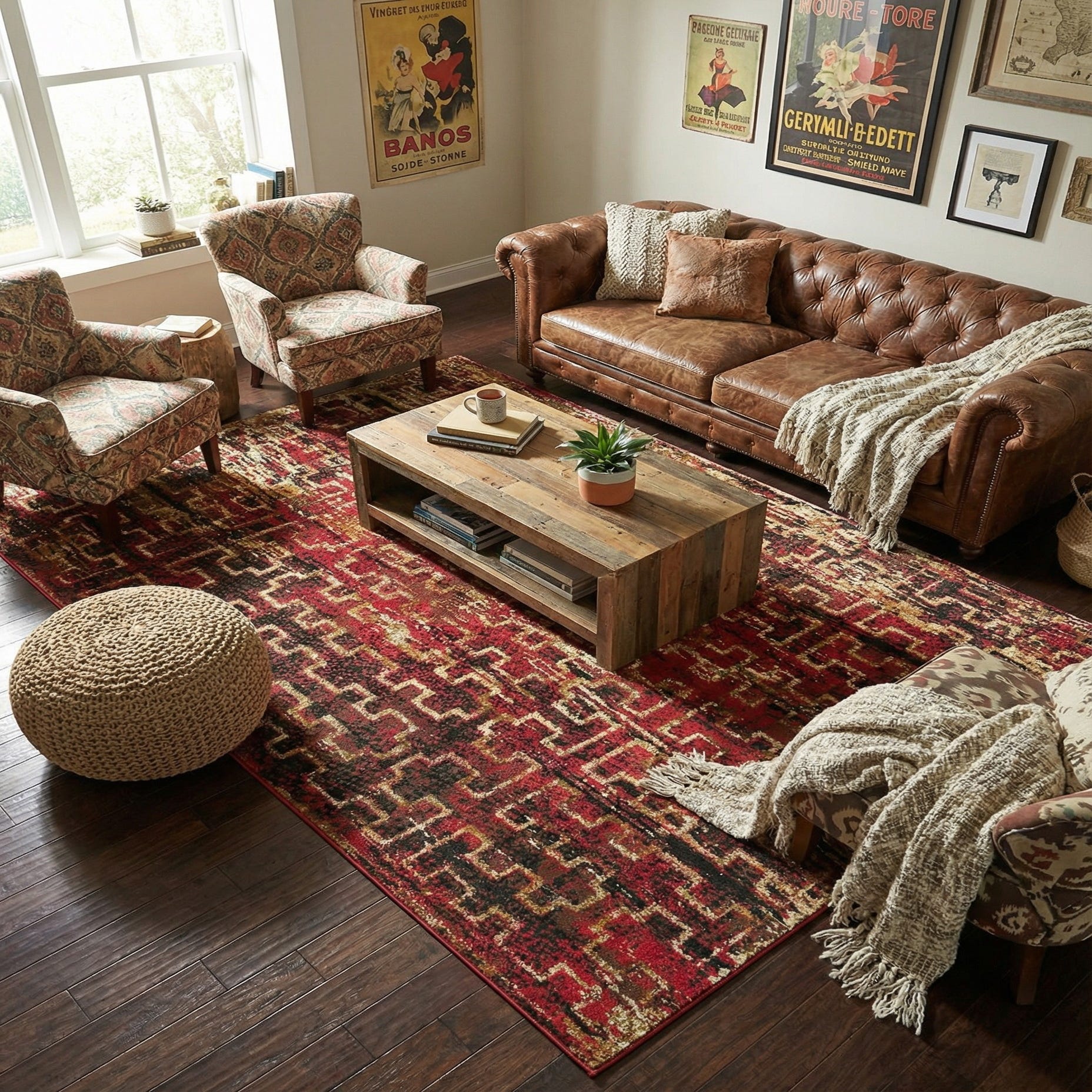 This rug is well suited to warm, collected interiors—place it beneath a seating group to anchor a living room or layer it under a dining table to introduce color and pattern. It pairs nicely with leather sofas and warm wood tones for an urban or industrial vibe, and also complements neutral, transitional settings when balanced with soft textiles and simple accessories. Machine-made, 100% polypropylene.