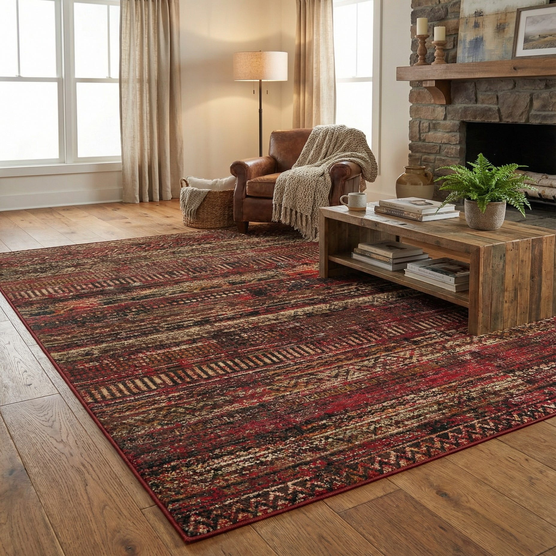 Warm and versatile, this rug pairs well with leather sofas, warm wood tones and neutral upholstery to create a cozy living room or den. It also complements eclectic, global, or transitional interiors—use it to ground a seating area, add color beneath a dining set, or bring layered warmth to a bedroom. The color palette and pattern work especially well in spaces that favor rich, earthy tones and layered textures.