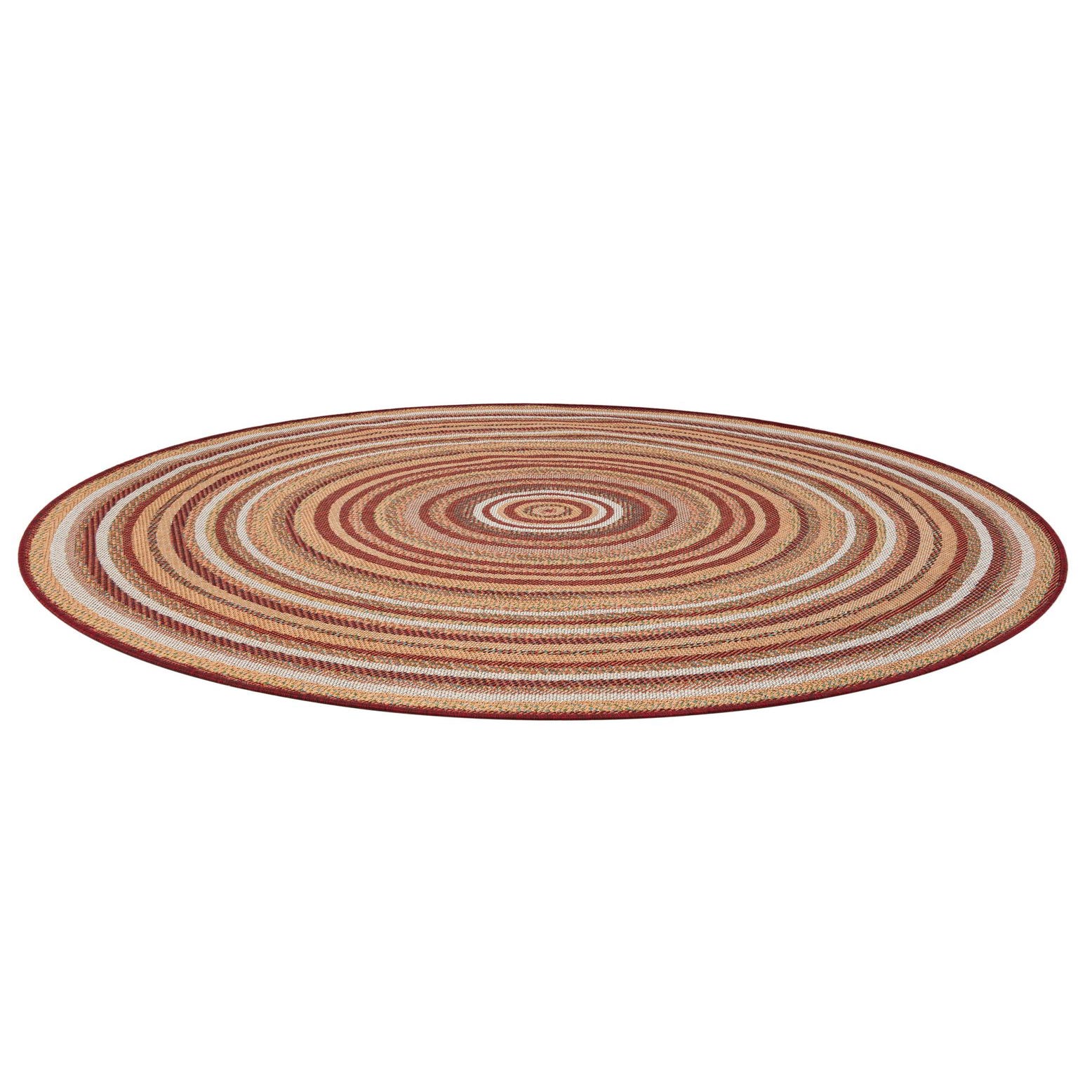 A 7' round Baja Outdoor rug by Rugs.com with concentric red, orange, and cream stripes, suitable for indoor or outdoor use.