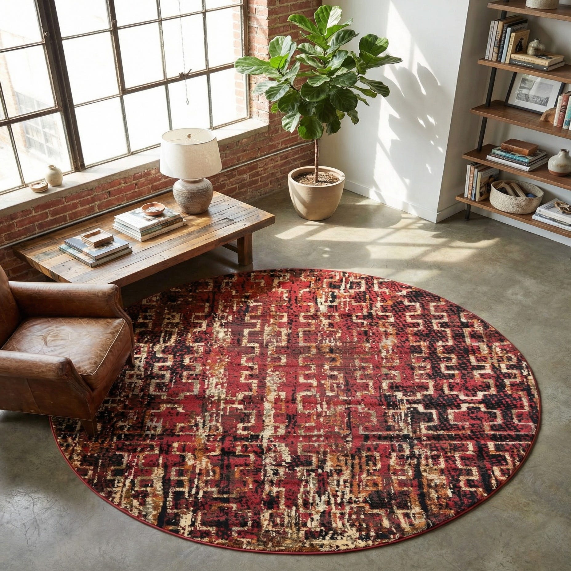 Machine-made from 100% polypropylene, the rug has a low-profile pile with a soft hand and subtle cushioning underfoot. Place it beneath a round dining table to define the setting, anchor a conversation area in a living room, or add warmth to an entry or den. It pairs beautifully with warm wood tones and brass or gold accents, leather or velvet seating, and neutral walls for contrast, or layer into a bold, eclectic scheme with mixed textures and jewel-toned accessories.
