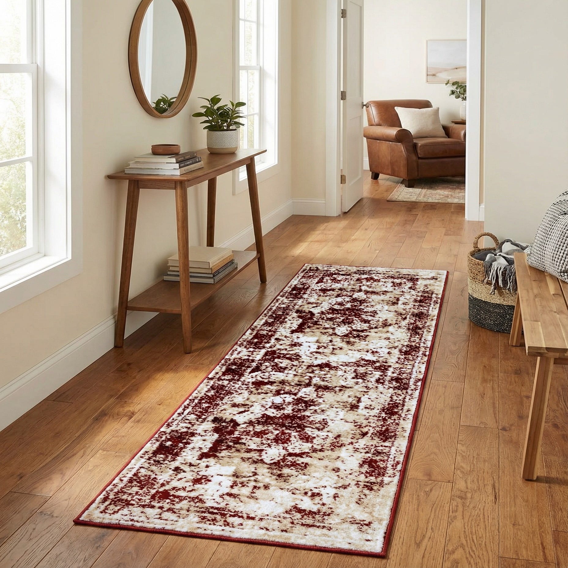 Primary color is Burgundy. Colors in this rug include: Burgundy, Beige, Ivory, Light Brown.