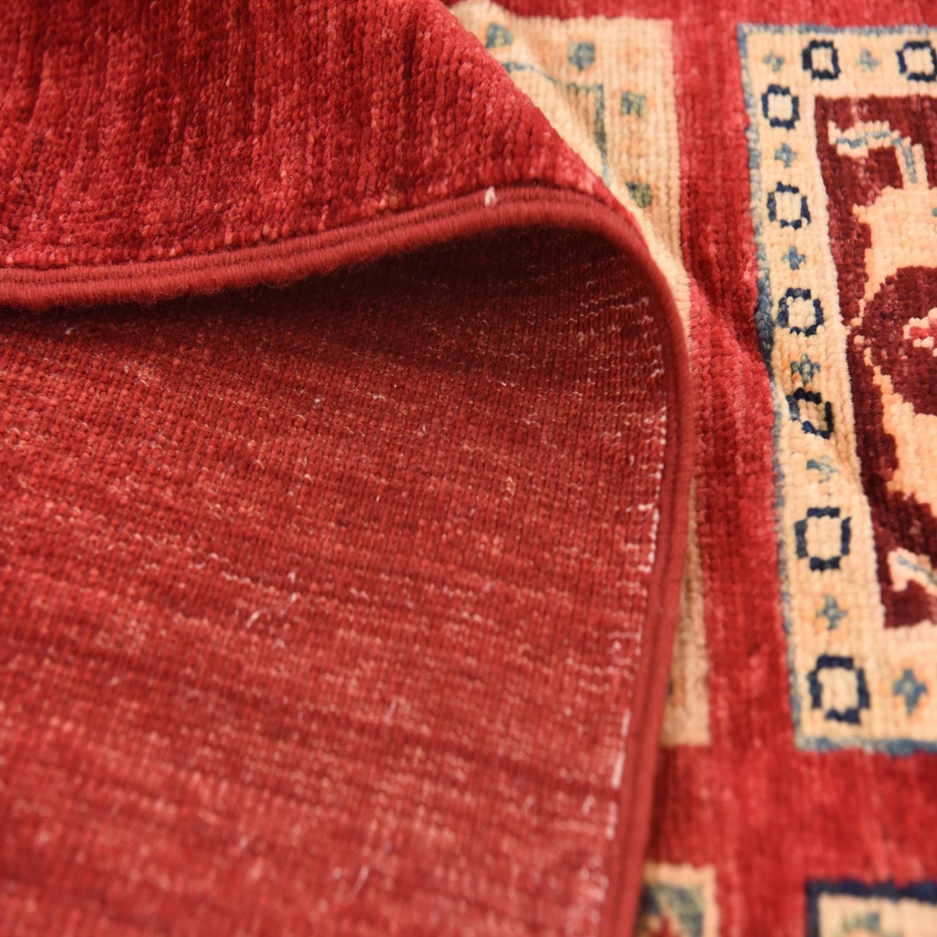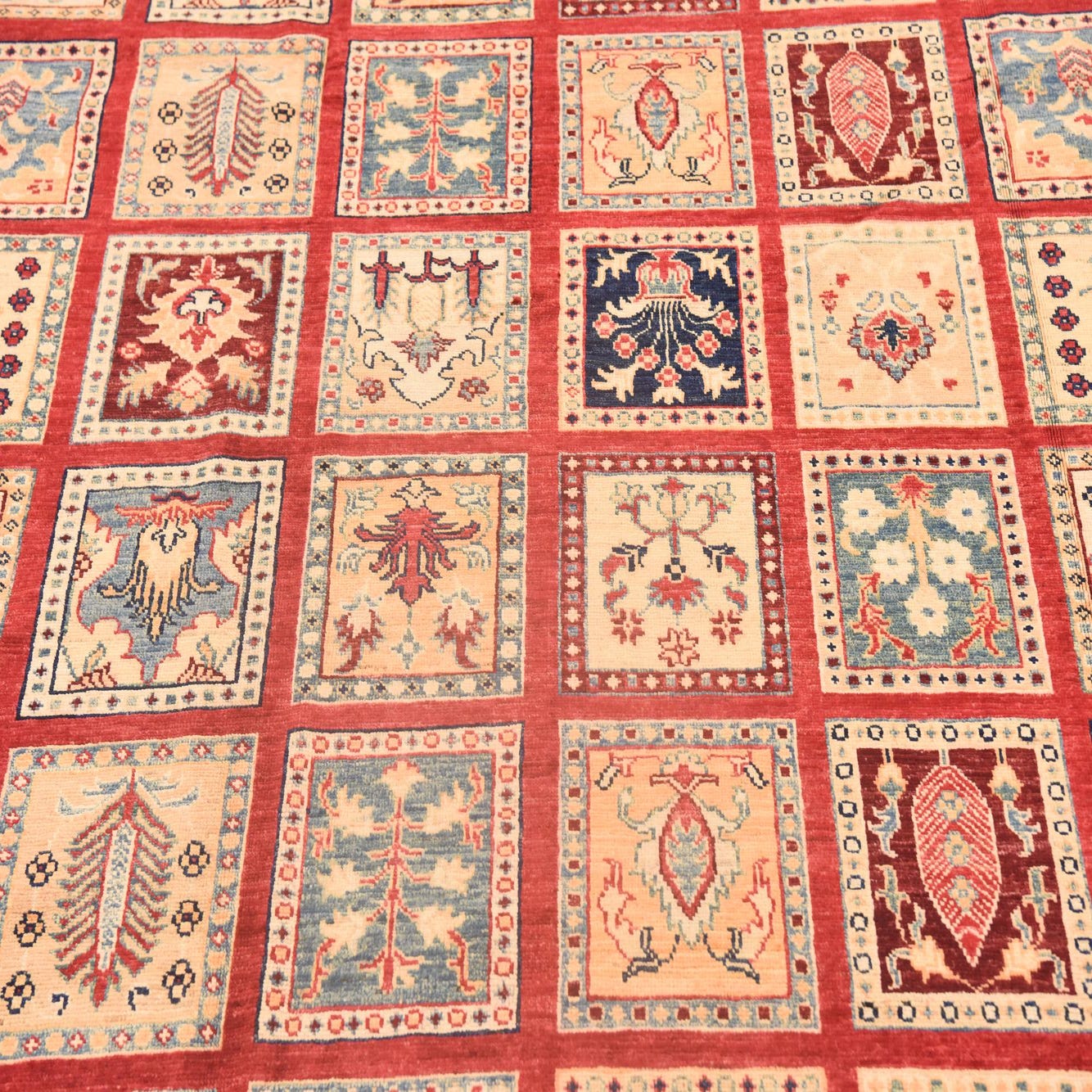 This Ariana Ziegler collection rug offers a sophisticated and traditional aesthetic, with a grid of unique geometric and floral medallions showcased in a rich burgundy background. The 7x10 hand-knotted rug is crafted from 100% hand-spun wool, promising durability along with its tactile, plush feel. The color palette includes accents of black, blue, cream, green, navy blue, orange, peach, maroon, and gold, creating a versatile and harmonious blend suitable for a variety of decors.