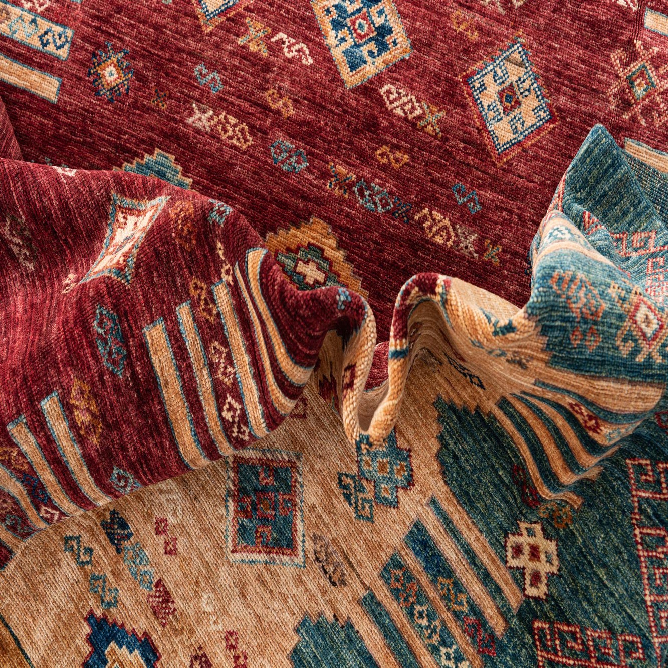 The Ariana Ziegler 7x10 hand-knotted rug is a testament to the artisanship of traditional rug making, crafted from 100% hand-spun wool. Its rich burgundy background sets the stage for a symmetrical pattern highlighted by hues of blue, brown, gold, green, and navy blue, creating a harmonious palette that is both warm and inviting. The design features a series of geometric motifs and borders that display intricate detailing, showcasing the precision of its weave. A subtle texture throughout the rug provides a tangible sense of quality and depth.