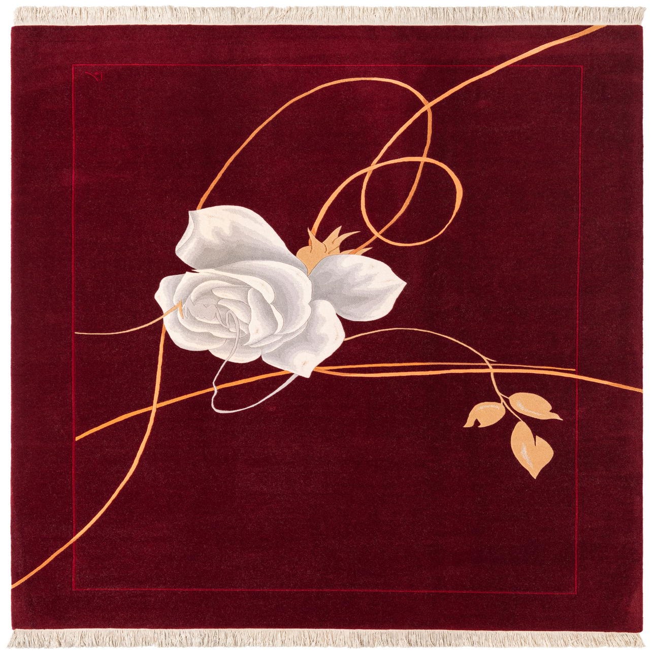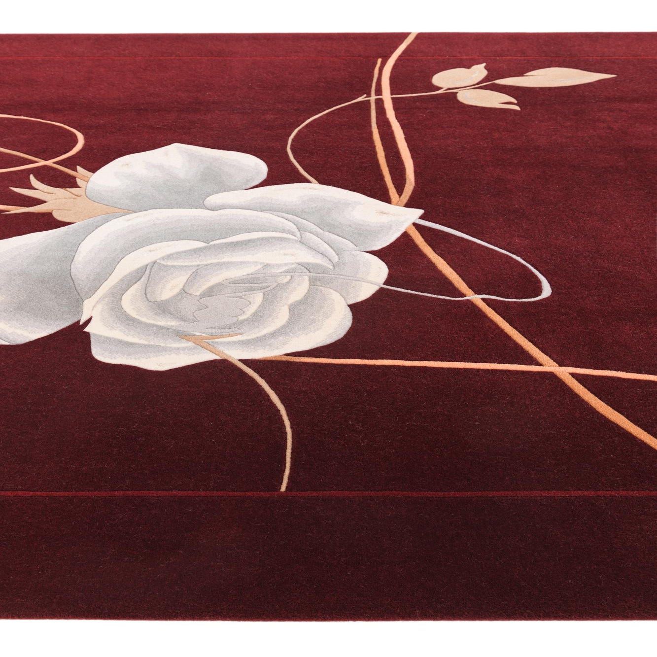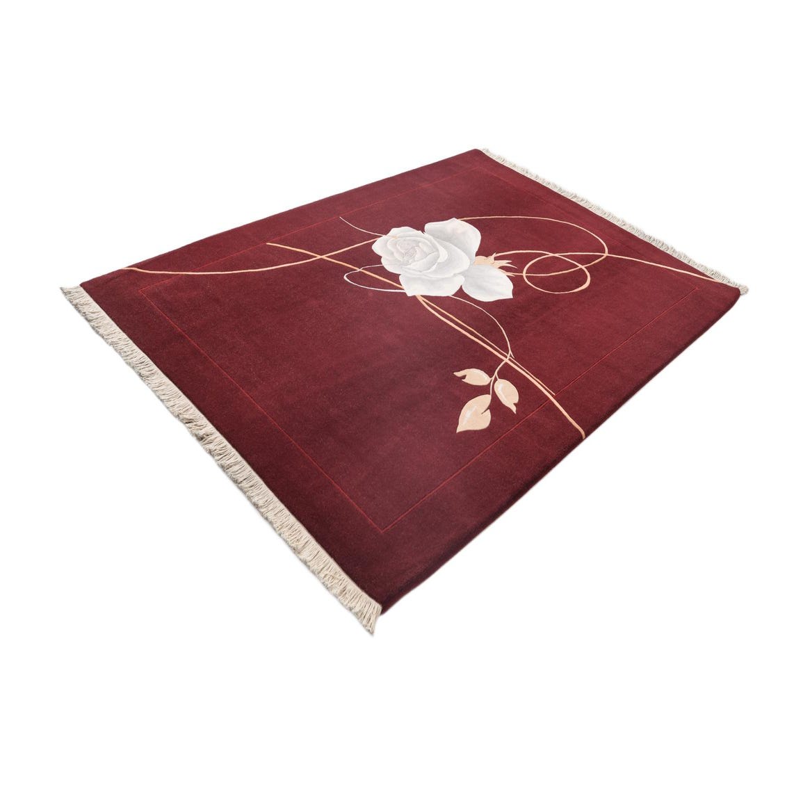 A 7x10 rectangular Darya rug in deep red with a large white rose and golden swirling vines.