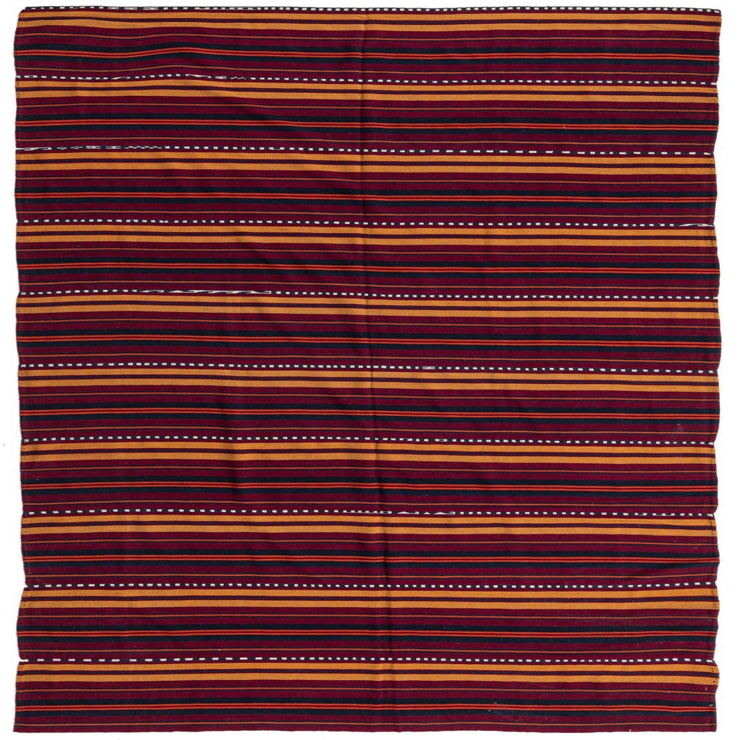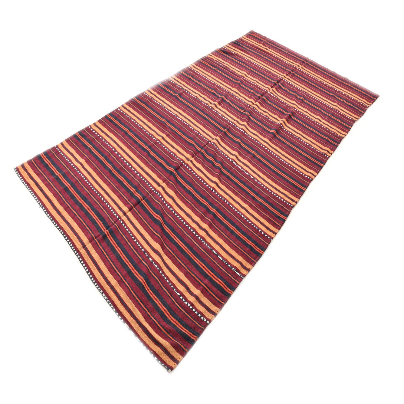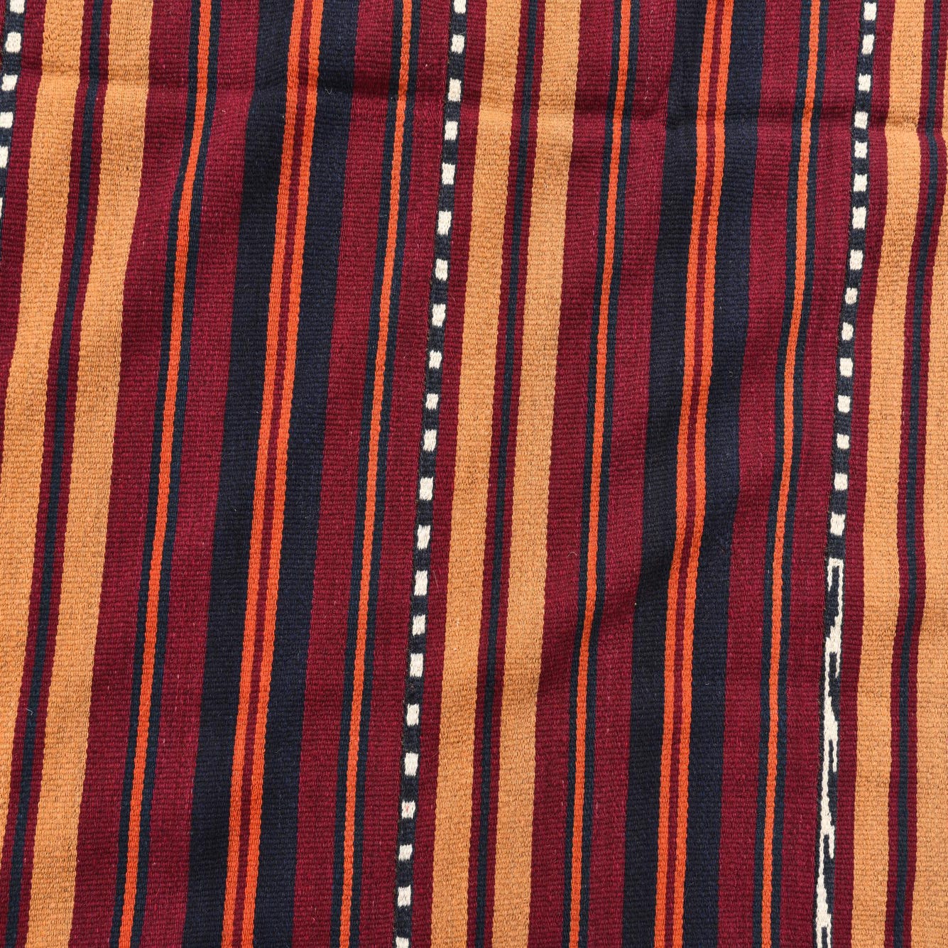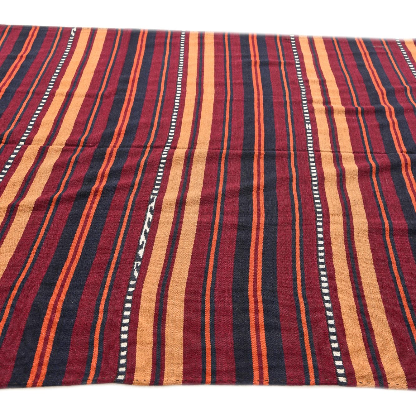 A 7x10 rectangular flatweave rug with alternating stripes of red, orange, and dark blue, featuring white dotted lines.
