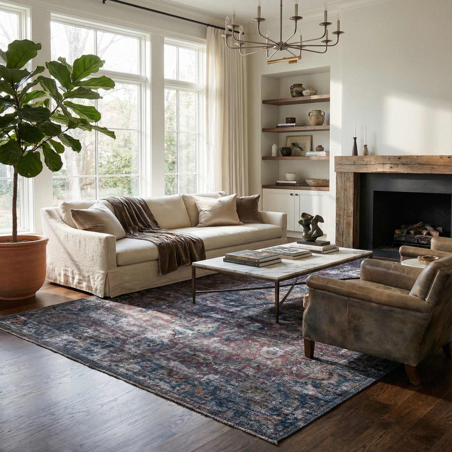 A 7x10 rectangular Ultra Vintage rug in distressed reds and blues with a faded Persian medallion pattern, suitable for a living room.