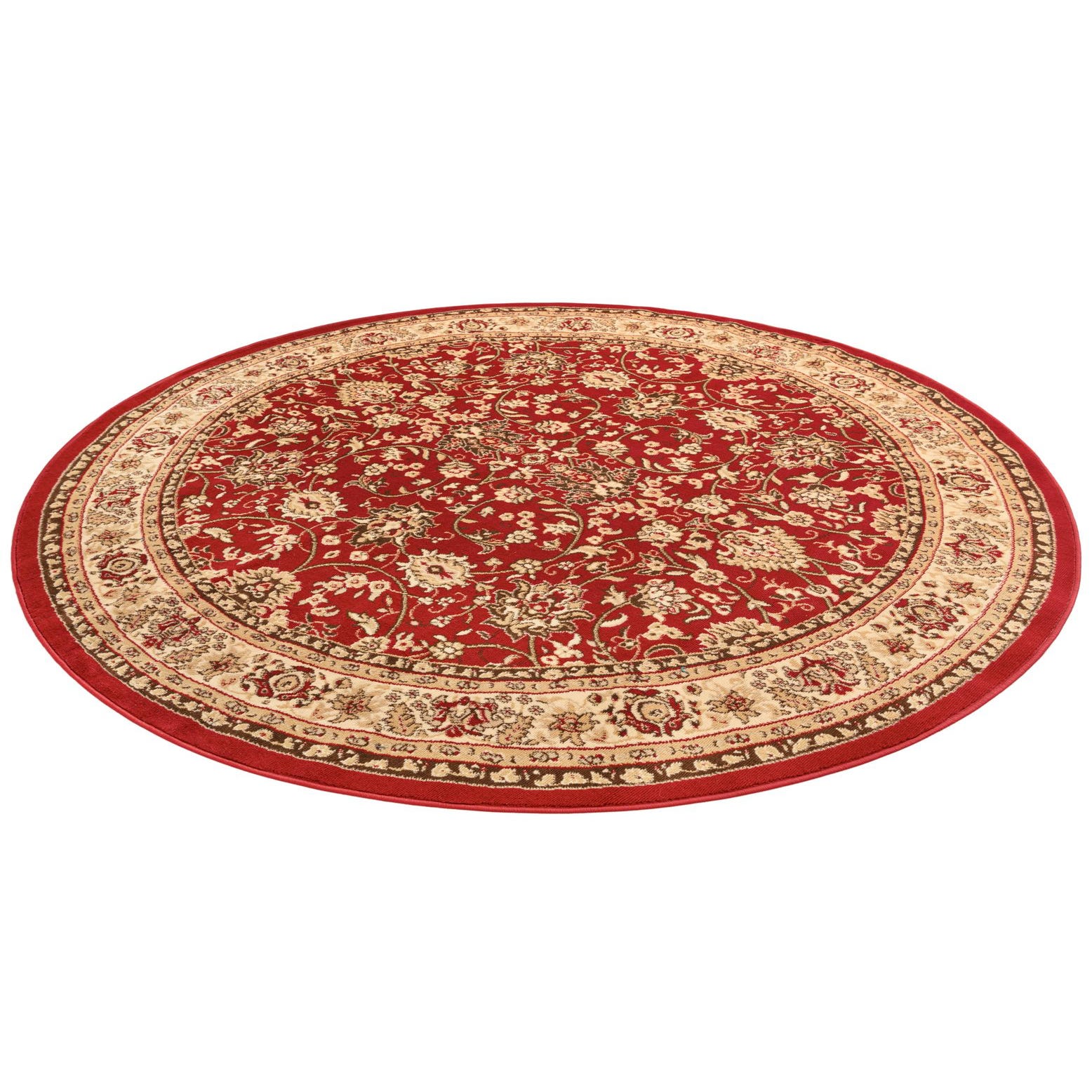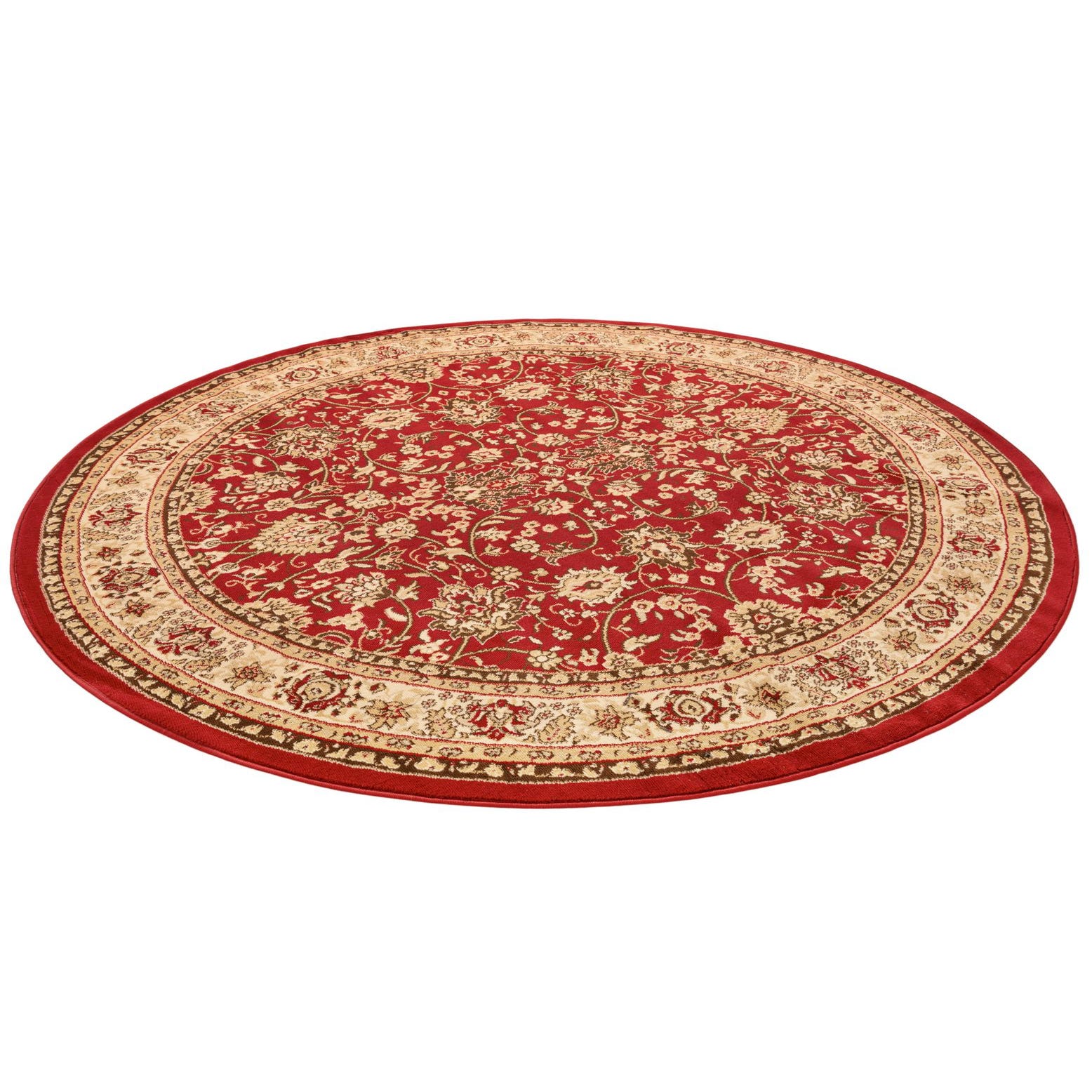 A 7' 10 round red rug with a traditional Oriental floral pattern in cream and gold, featuring a detailed border.