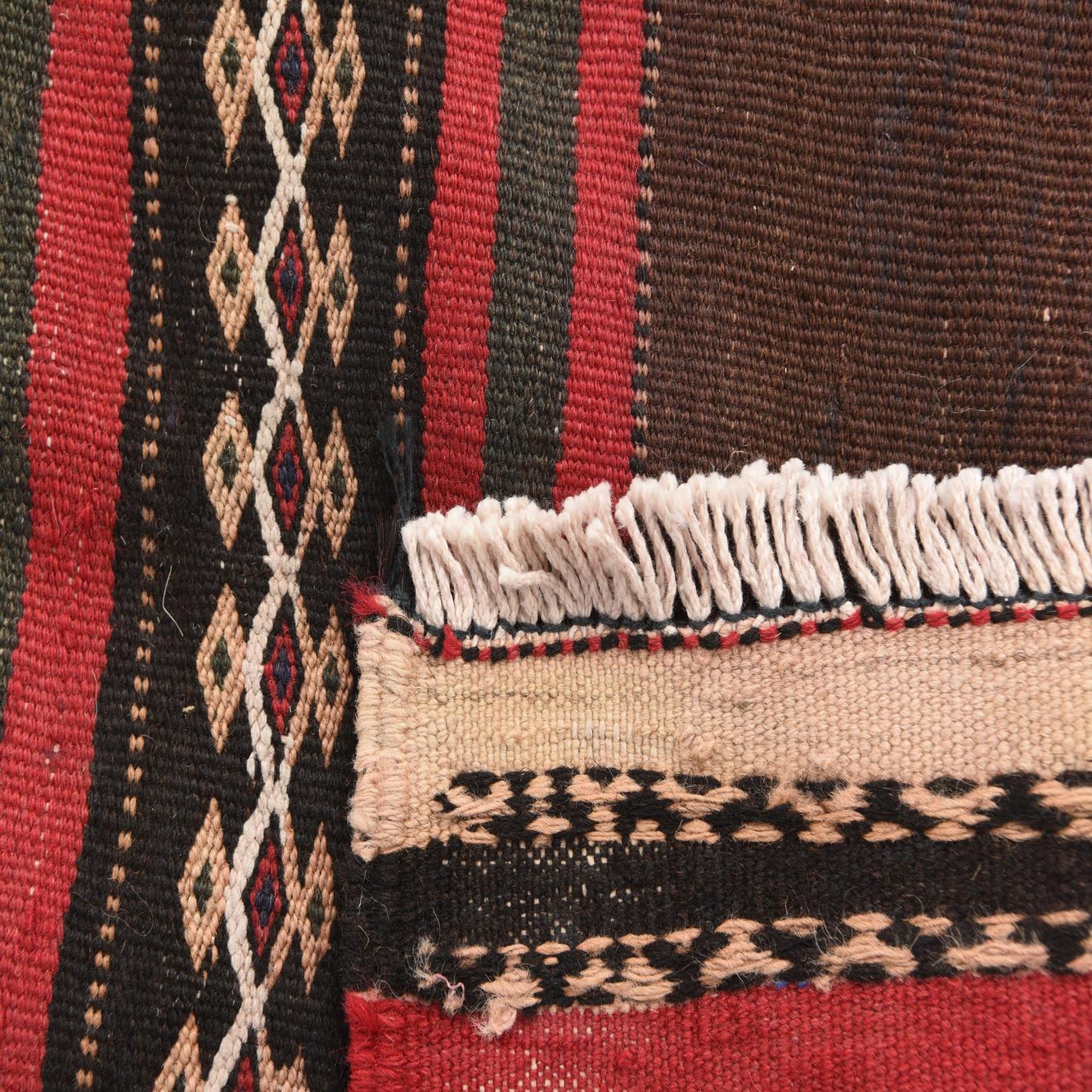 This Kilim Afghan 8 Ft Runner rug showcases a rich, burgundy background with a series of traditional, geometric stripes that incorporate a tasteful color palette of brown, red, green, black, and beige. The hand-woven 100% wool construction exhibits a flatweave texture, indicative of the Kilim style, offering both durability and cultural authenticity. The horizontal striping and fringe detail add a sense of movement and rustic charm to the piece.