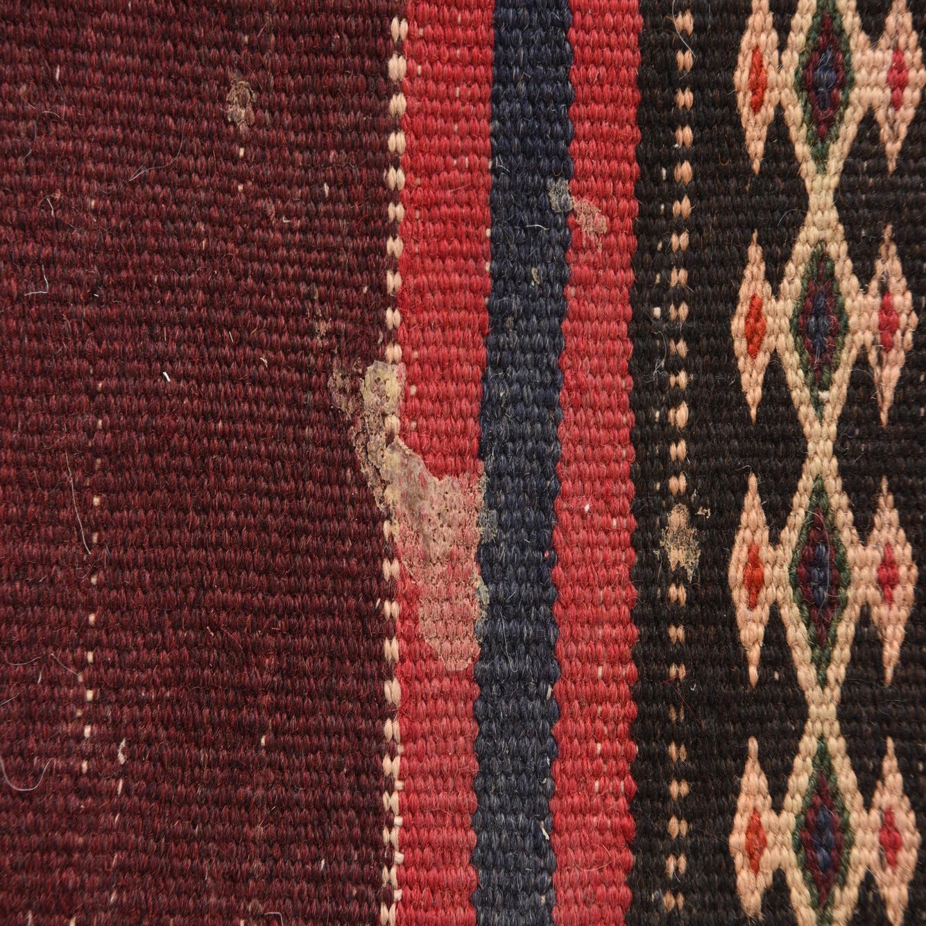 The rug's well-defined patterns and earthy tones make it exceptionally versatile, allowing it to complement a variety of interior designs from classic to contemporary. Ideal for spaces such as hallways, entryways, or kitchens, this runner could serve as a visual anchor in minimalist environments or as an integral component in a more eclectic aesthetic. Its semi-antique status (40-60 years old) brings a storied element to the décor, while the noted condition detail of a spot stain contributes to its history and character without diminishing its appeal. The inclusion of fringe on this piece underscores its traditional heritage and craftsmanship.