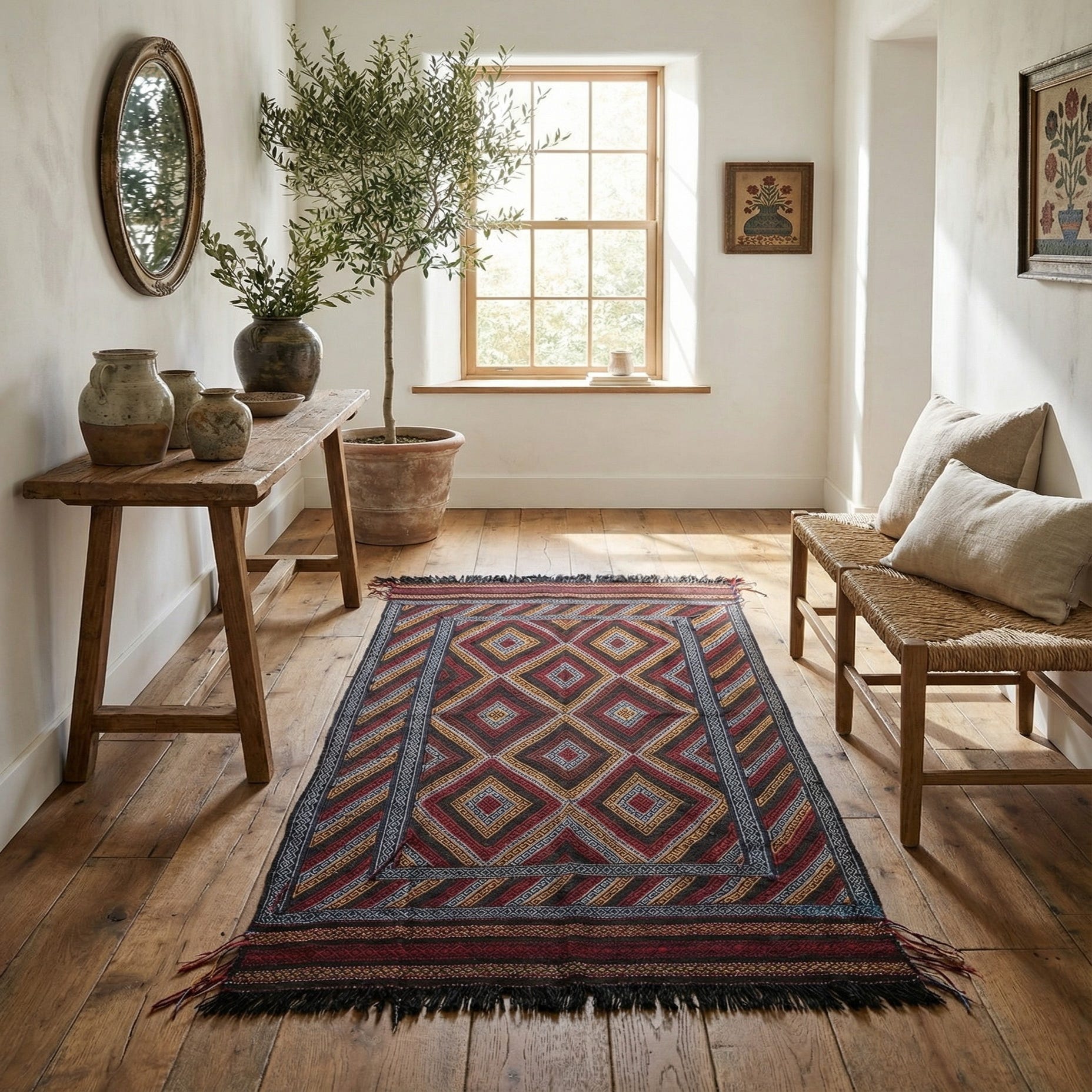 The rug's flatweave construction provides a tactile experience and durability, while the presence of fringe on the ends adds a traditional appeal. The balanced distribution of warm and cool tones allows this runner to integrate smoothly into a range of interior design themes, from rustic to more contemporary settings. Ideal spaces for this rug include entryways, corridors, and alongside kitchen islands where its visual narrative can be appreciated. Due to its color scheme and pattern, it pairs well with both wood and tile flooring, harmonizing with natural elements or contrasting modern interiors.