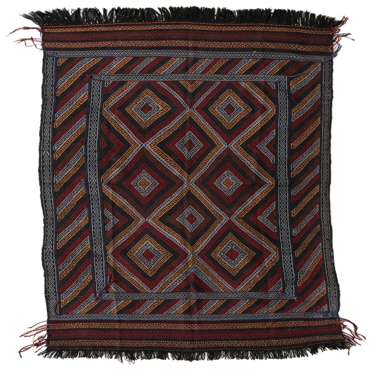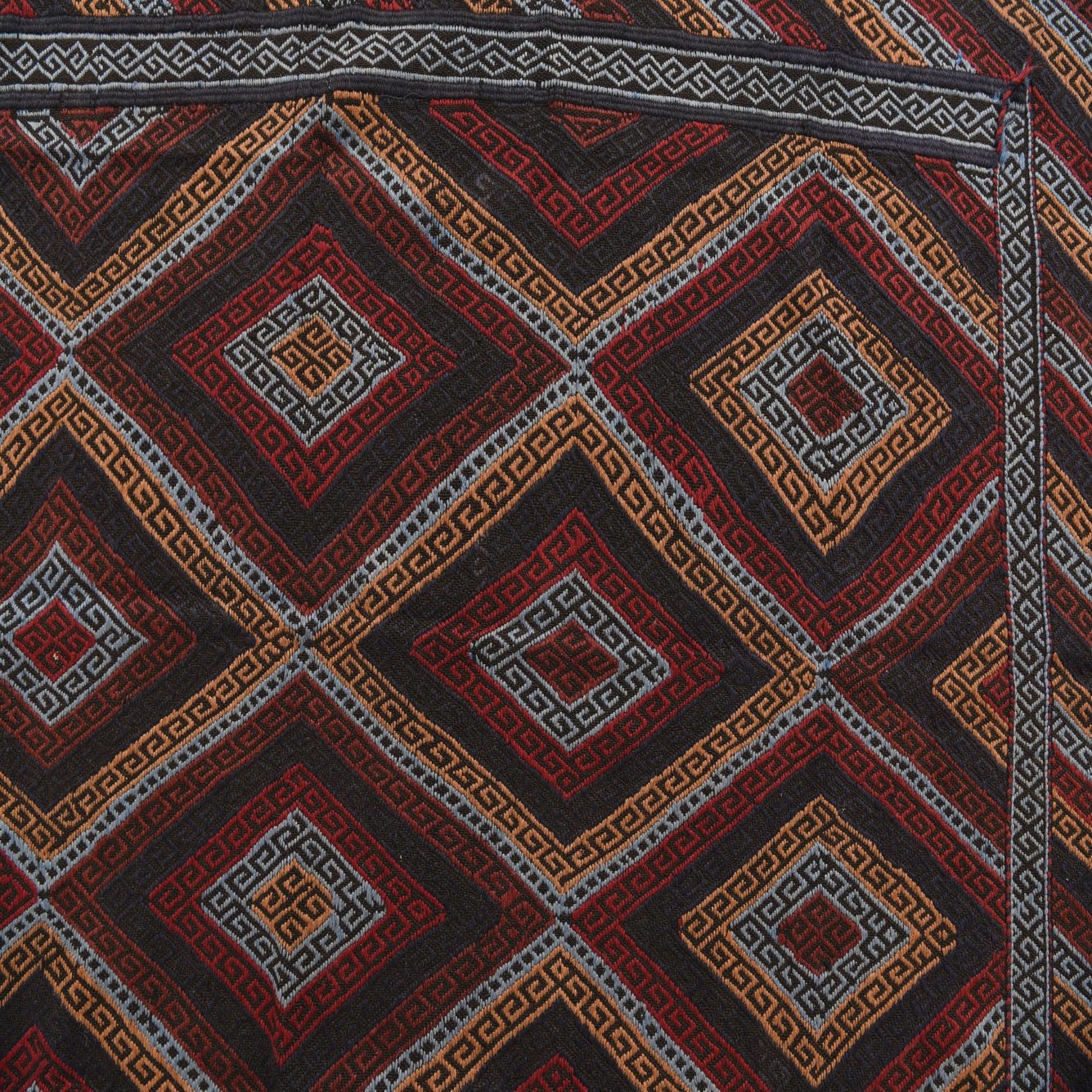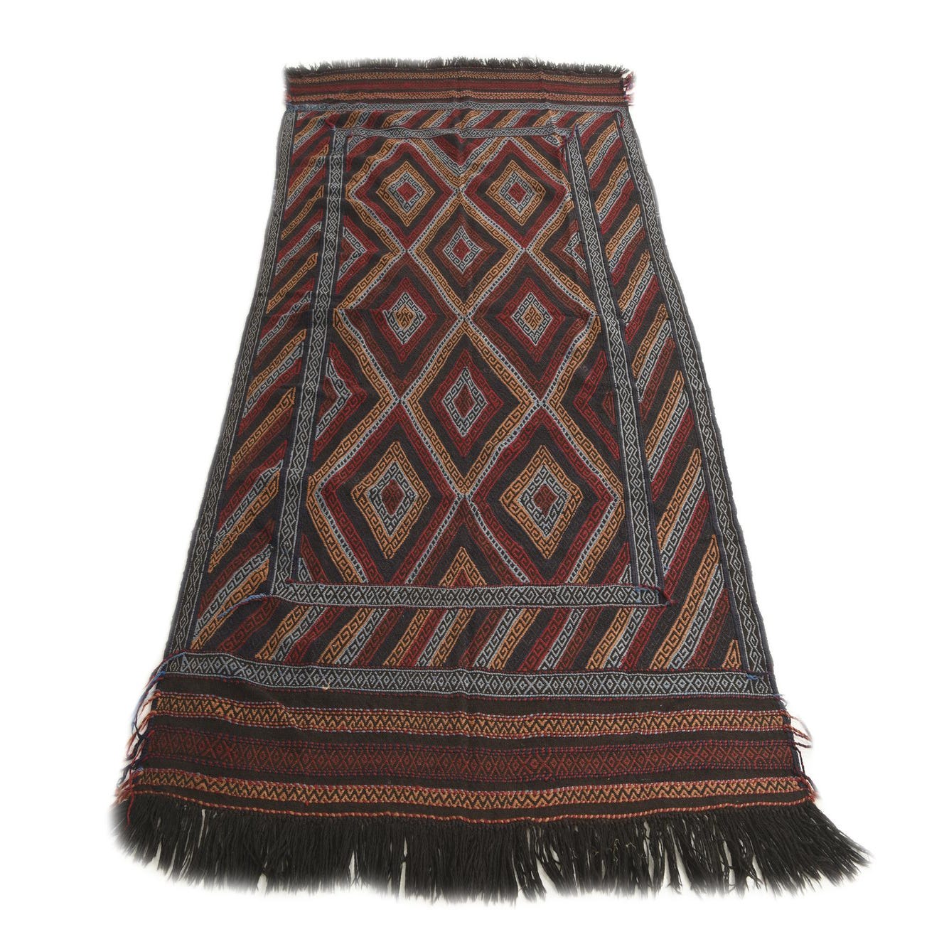 The Kilim Fars collection boasts a hand-woven 100% wool runner measuring 8 feet in length, which elevates any hallway or elongated space with its authentic charm. This semi-antique piece holds a dynamic geometric pattern that captures attention, consisting of a series of interconnected diamonds and intricate borders. Its rich palette of burgundy anchors the design, complemented by meticulous detailing in black, ivory, orange, red, light blue, and navy blue, adding depth and complexity to the aesthetic.