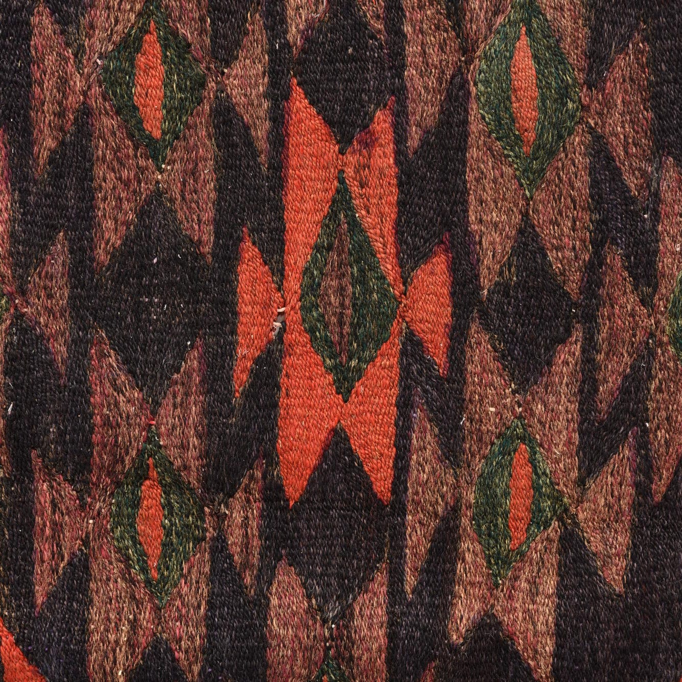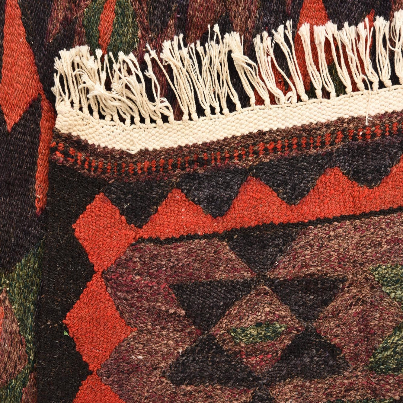 The texture of the rug is characteristic of traditional kilim flatweaves, with a smooth surface that speaks to the meticulous handiwork and densely woven nature of its construction. This semi-antique rug, aged between 40-60 years, carries with it a sense of history and cultural heritage. The presence of small spot damage adds character, emphasizing its journey through time. Finished with fringe edges, it brings a classic touch to the piece.