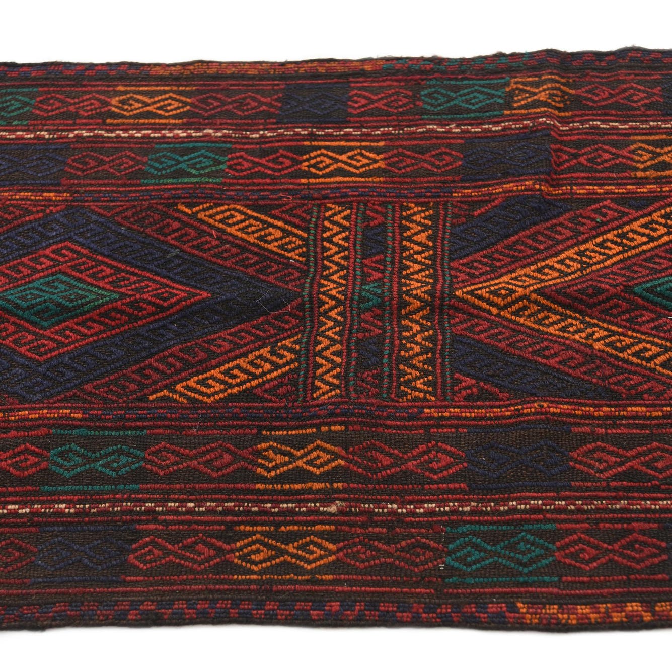 The Kilim Fars collection presents an authentic 8 ft runner that captures the essence of traditional craftsmanship. Hand-knotted from 100% wool, this runner is a testament to enduring design and quality. It features a rich burgundy background accentuated with a harmonious blend of black, brown, navy blue, orange, terracotta, and green hues. The geometric pattern boasts a series of intricately designed diamonds and motifs that showcase the skill and precision involved in its creation.