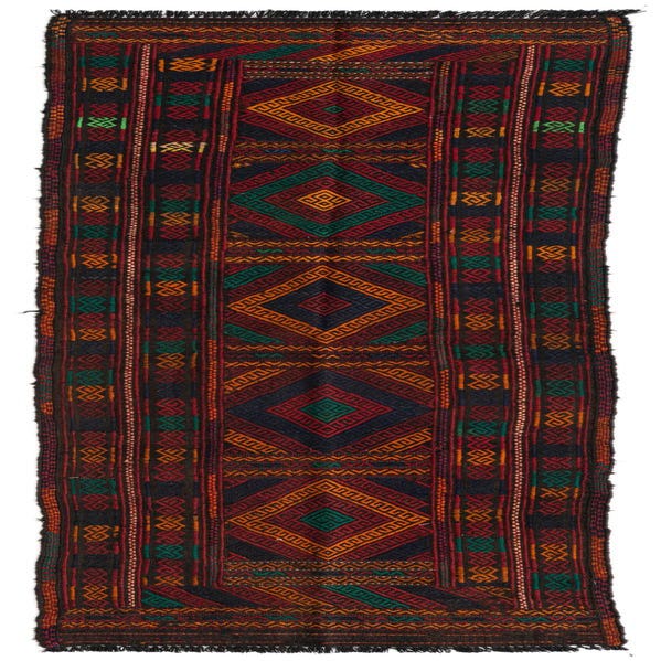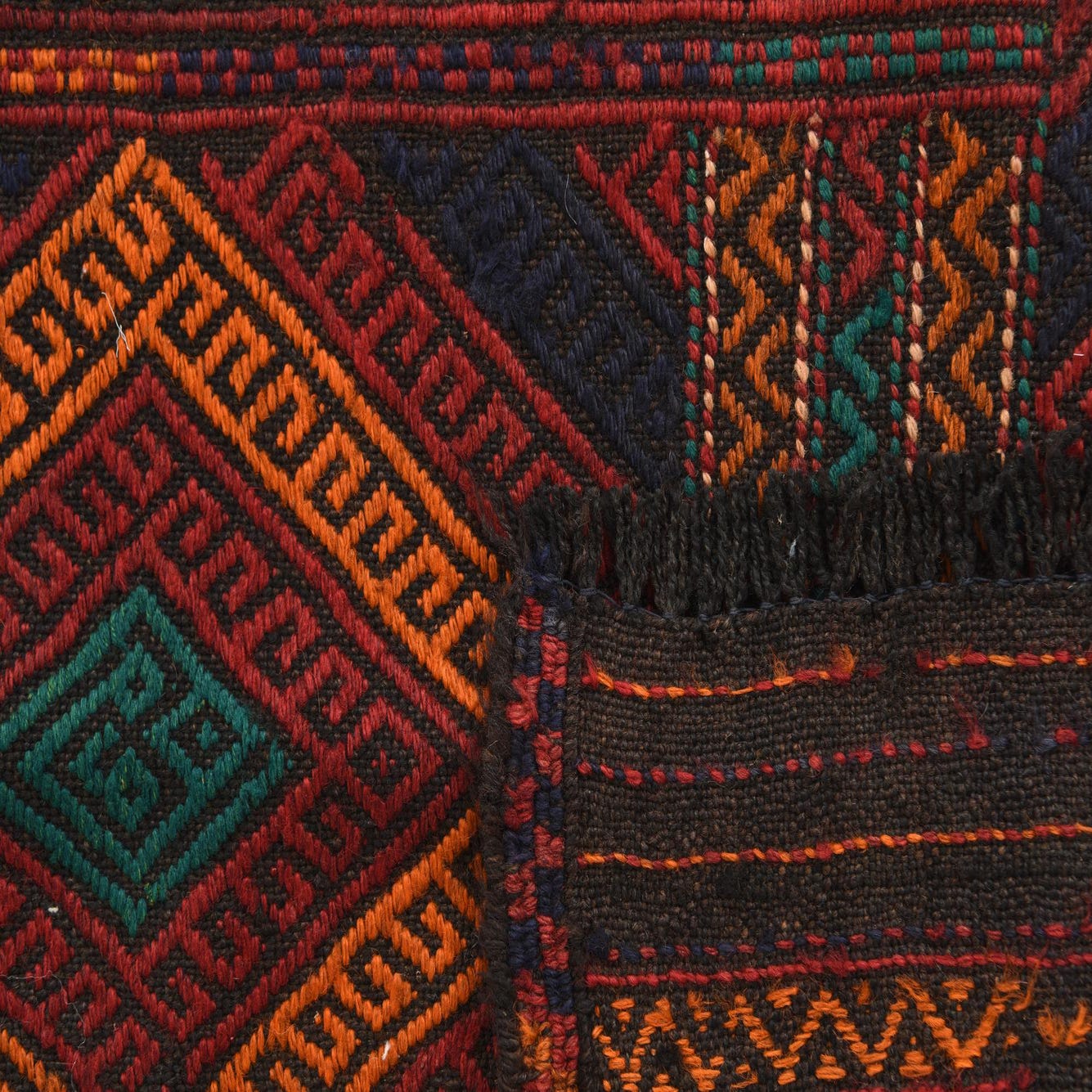 Primary color is Burgundy. Colors in this rug include: Burgundy, Black, Brown, Navy Blue, Orange, Terracotta, Green.