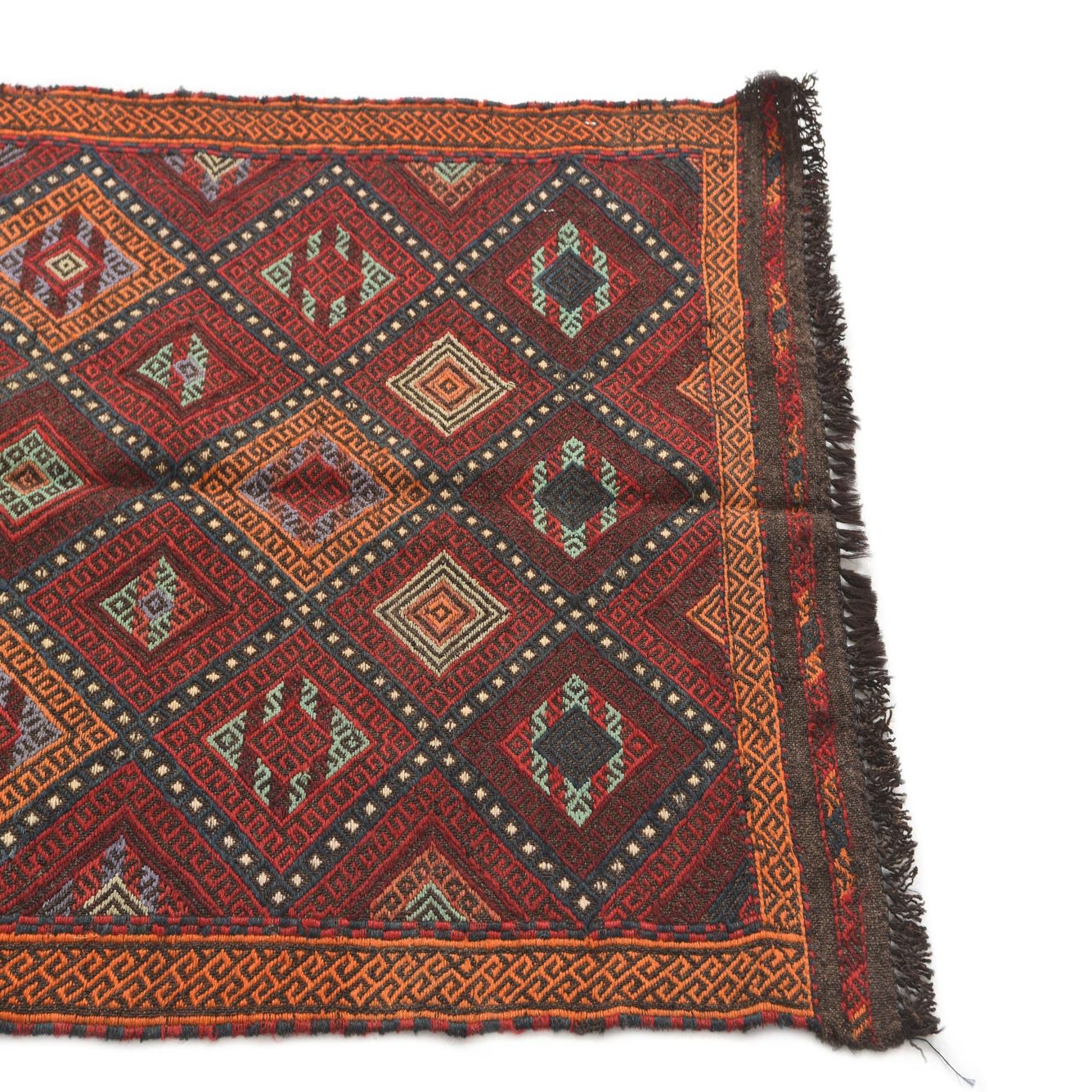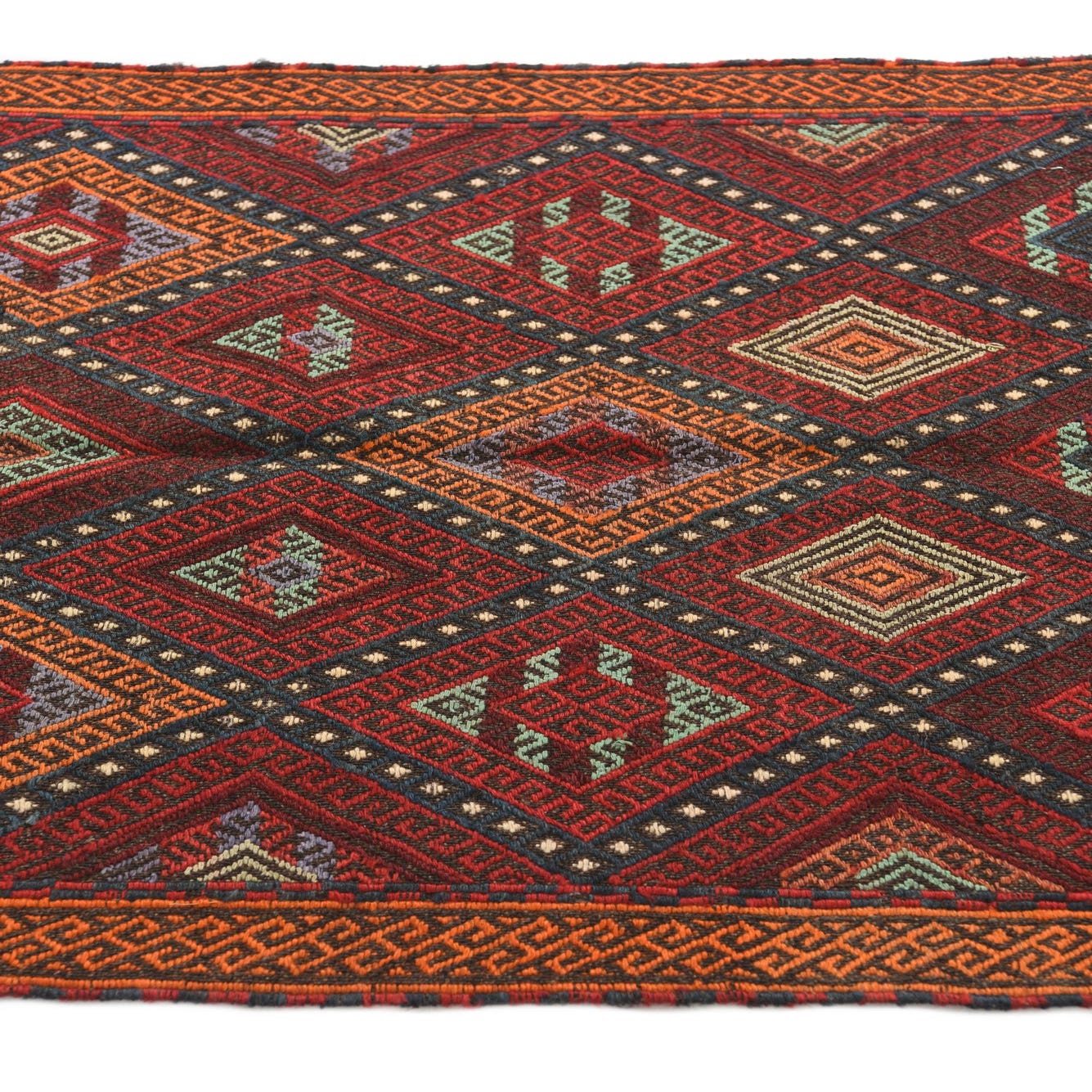 A vibrant 8 ft runner rug from the Kilim Fars collection, featuring a tribal geometric pattern in rich reds, oranges, and deep blues, handmade from 100% wool.