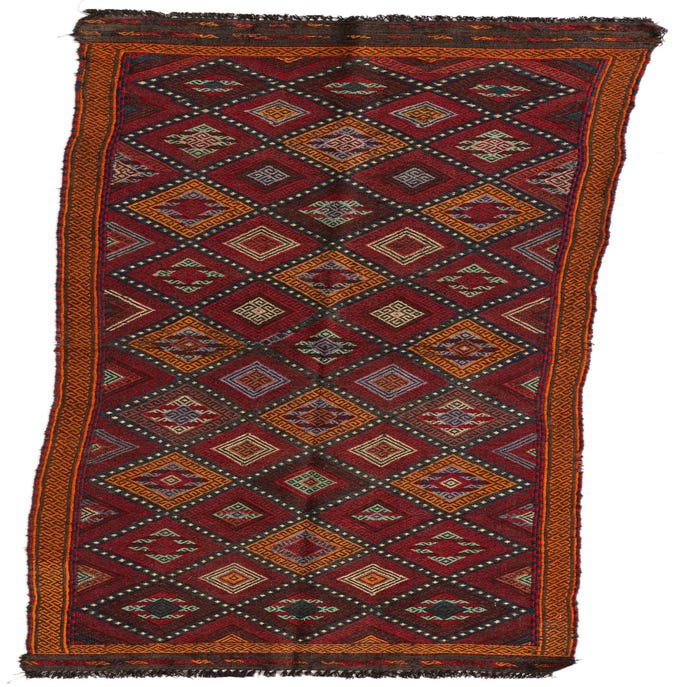 Primary color is Burgundy. Colors in this rug include: Burgundy, Beige, Black, Orange, Green.