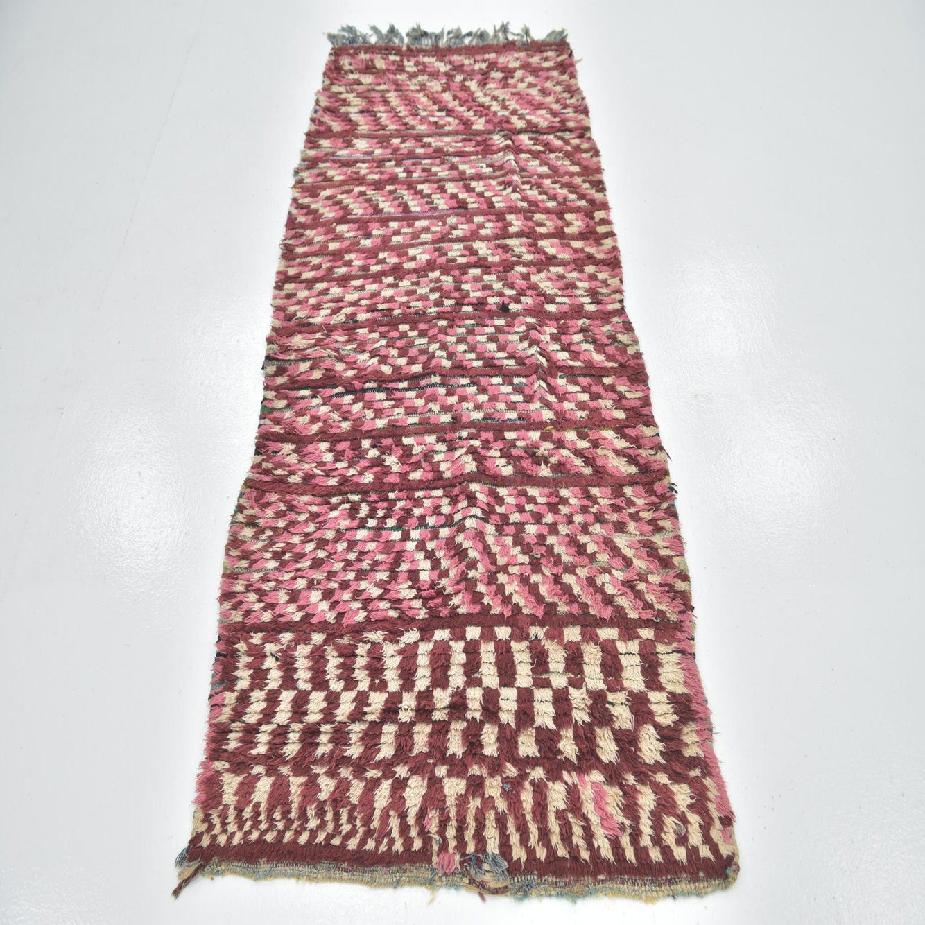 This hand-knotted runner from the Moroccan collection showcases a richly hued burgundy background with highlights in a softer puce, creating a distinctive pattern that harmonizes with a variety of home decor styles. The expert craftsmanship of 100% wool offers a dense, plush texture that underfoot feels welcoming and luxurious.