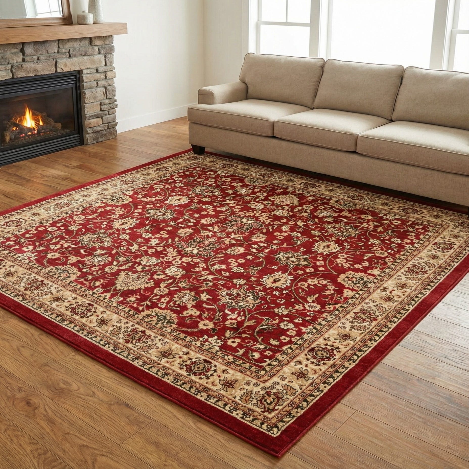 The Yasmin Collection offers a richly traditional design woven into an 8 Ft Square rug that brings a sense of regal elegance to any room. The deep burgundy background is embellished with ornate floral patterns and bordered by intricate detailing, all in a palette featuring shades of beige, brown, and cream. This rug is machine-woven of 100% polypropylene, offering a soft texture and durability. Its construction is designed to be stain-resistant and shed-free, providing both lasting beauty and practicality for high-traffic areas.