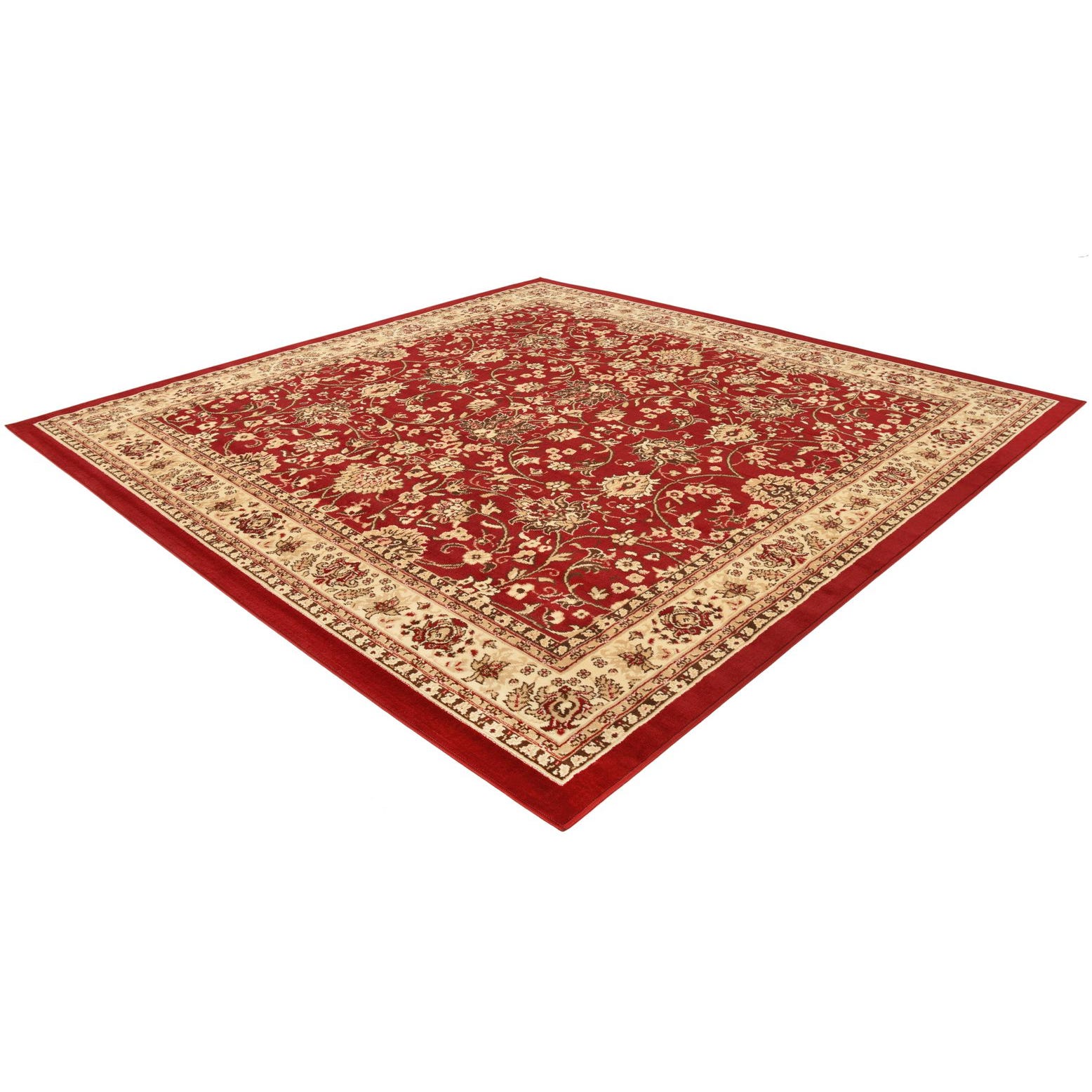The Yasmin Collection offers a richly traditional design woven into an 8 Ft Square rug that brings a sense of regal elegance to any room. The deep burgundy background is embellished with ornate floral patterns and bordered by intricate detailing, all in a palette featuring shades of beige, brown, and cream. This rug is machine-woven of 100% polypropylene, offering a soft texture and durability. Its construction is designed to be stain-resistant and shed-free, providing both lasting beauty and practicality for high-traffic areas.