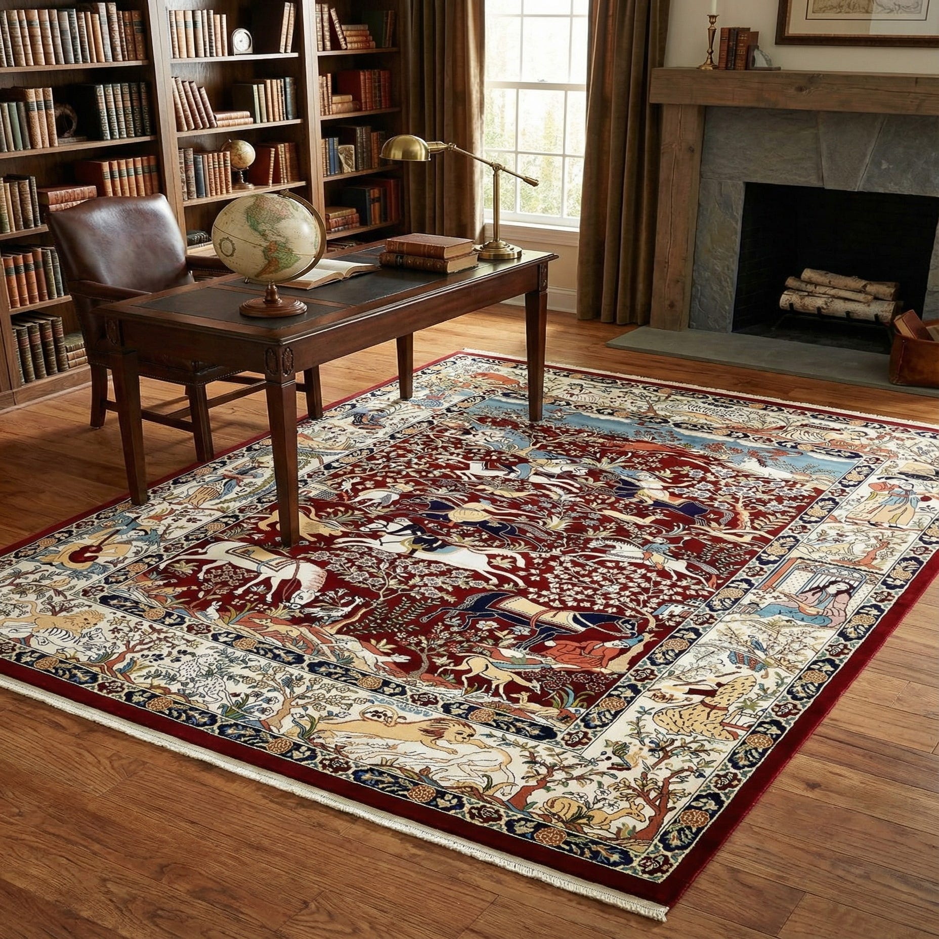 A classic Persian-inspired pattern unfolds across a rich burgundy ground, where a detailed pastoral and hunting scene fills the field with horses, birds, and flowering vines. Finely drawn motifs in blue, navy, cream, ivory, green, plum red and tan provide contrast and movement, while a cream-bordered margin frames narrative vignettes and stylized floral bands that give the rug a storybook quality. The overall effect balances intricate ornament with clear, structured borders for a traditional, timeless look.